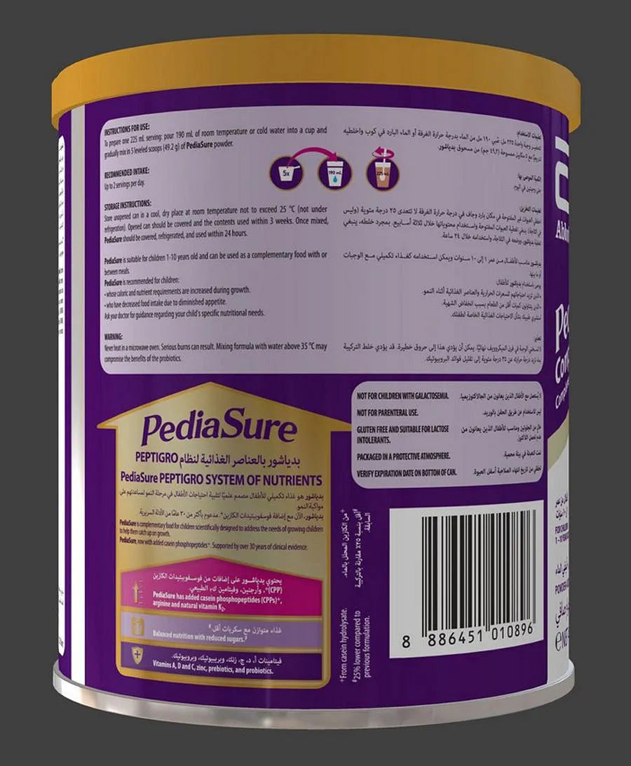 Balanced nutrition to help kids, 1 year of age or older, grow with Triple Sure System, that includes 37 nutrients to support growth and development. Pediasure, now with added arginine and natural vitamin K2, provides all essential nutrients needed for healthy growth. It contains high-qulaity protein, calcium and Vitamin D with prebiotics and probiotics. It can be used as a complementary food with or between meals.