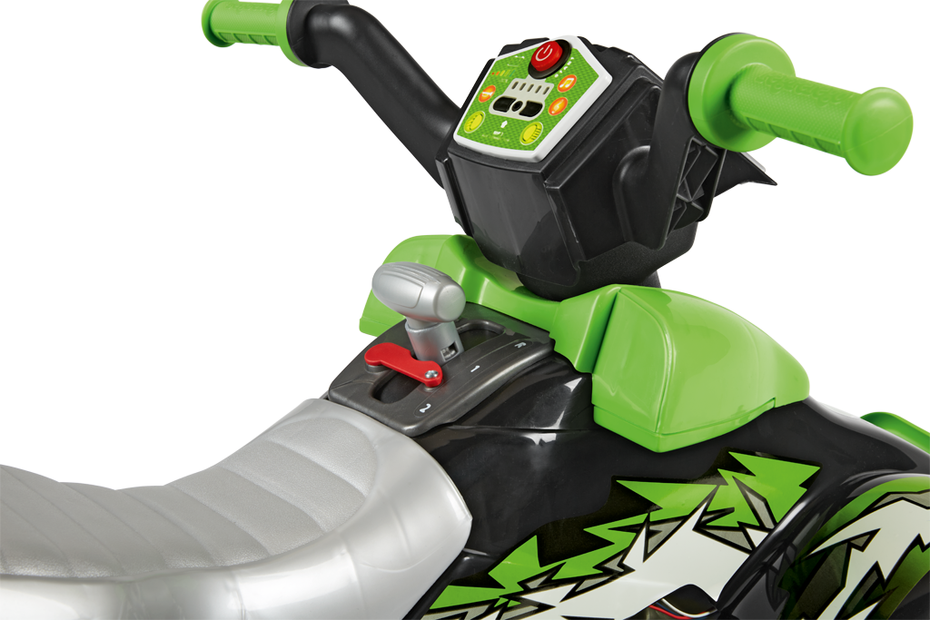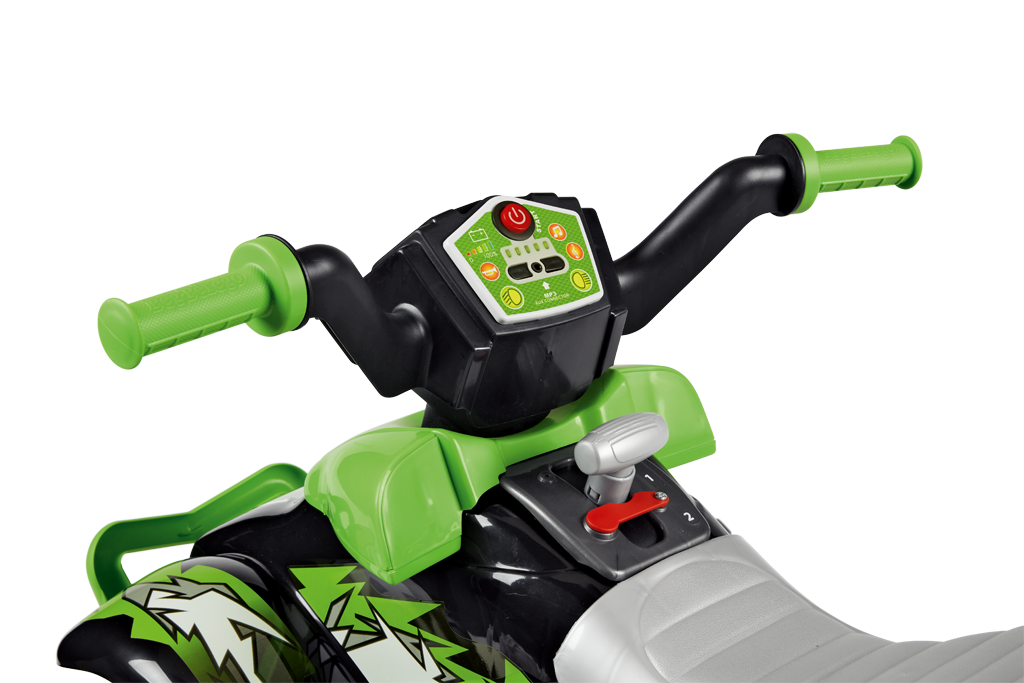 - Lights and Music - Switch on the electric dashboard by using the START button or pressing the accelerator pedal, and you'll be amazed!! In addition to switching on the LED light on the front lamp, your child will also be able to hear the engine roar, operate the horn, and listen to pre-recorded tunes. Moreover, he or she can listen to their favorite music via a port for MP3 players (not included)