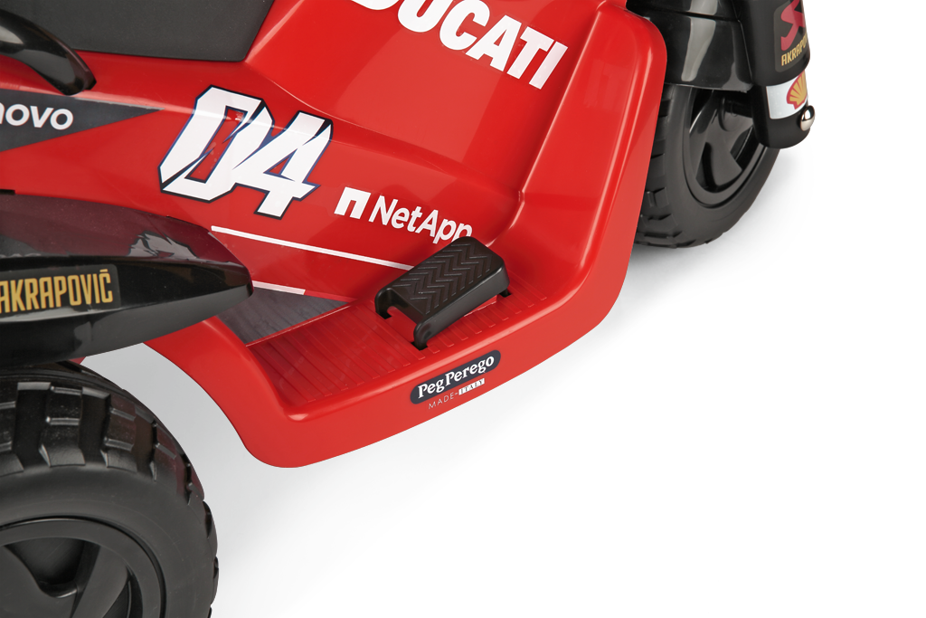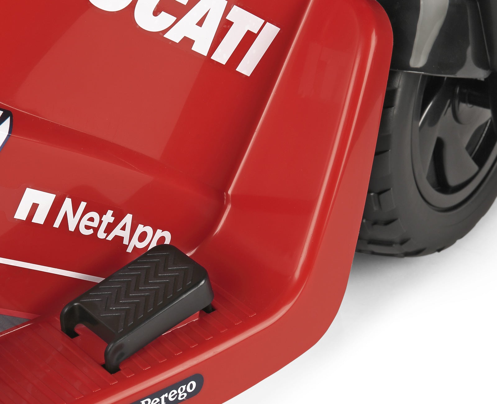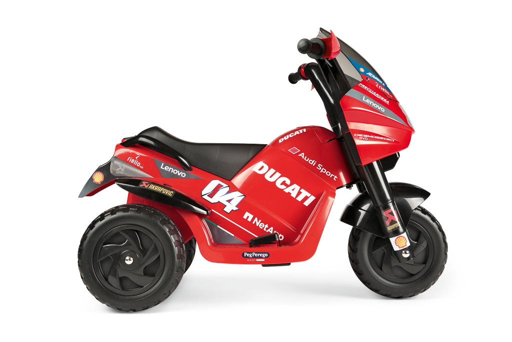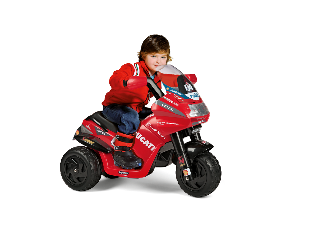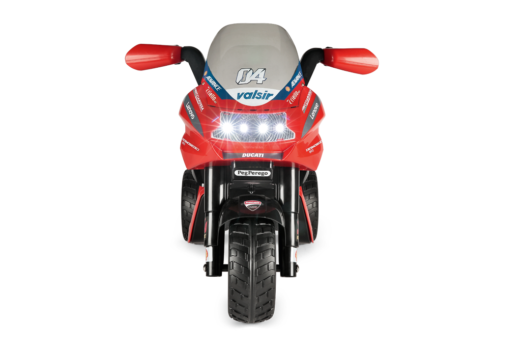 The legendary Ducati Desmosedici Evo - for Ducati bikers of the future. This all-Italian gem shows its extraordinary "EVOlution" with its even higher-performing characteristics. Lights, sounds, music and a horn, for great fun from the age of 2. The electric motorcycle operates with a 6V/4.5Ah/25Wh rechargeable battery.