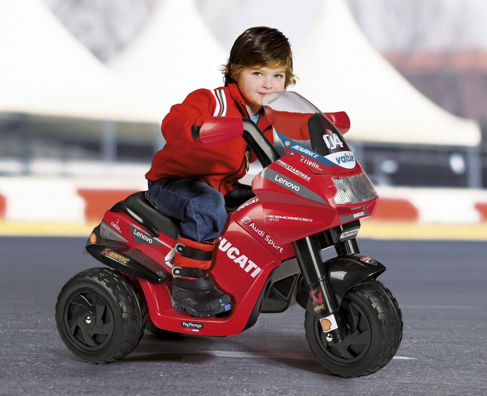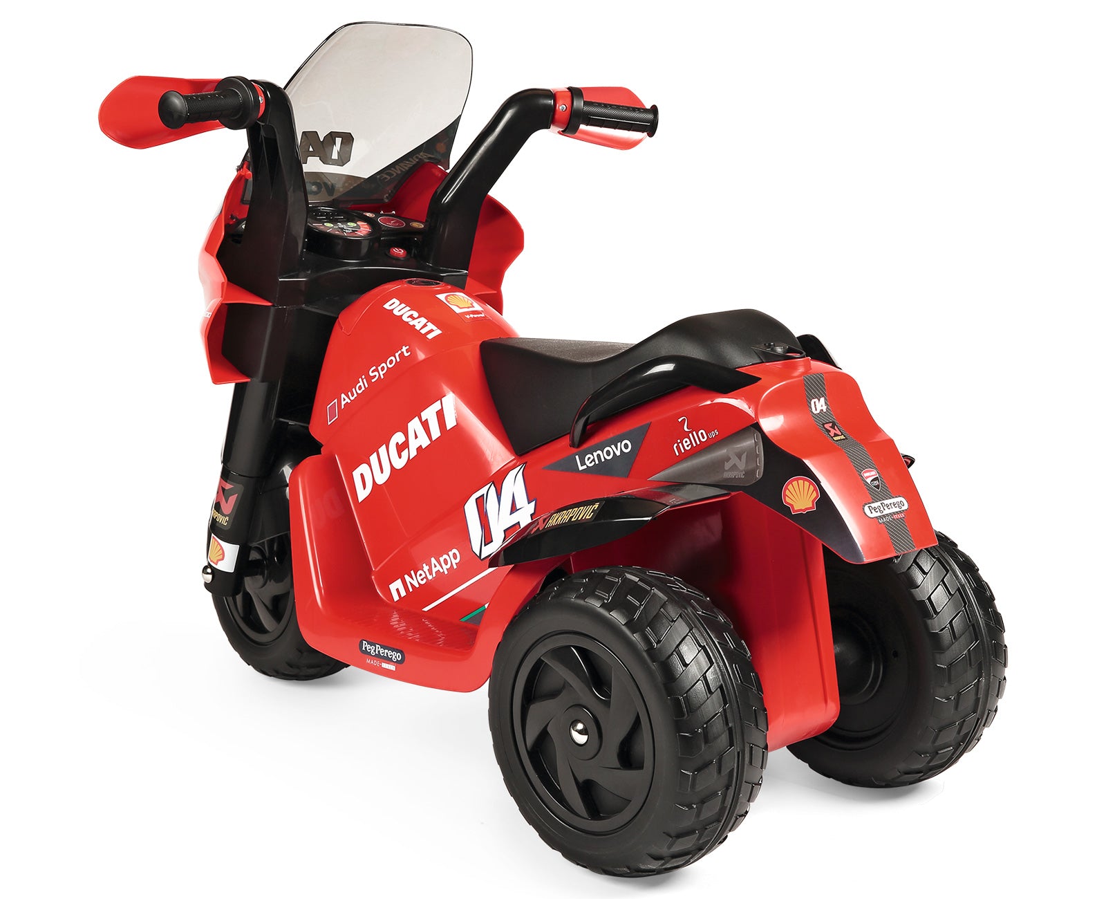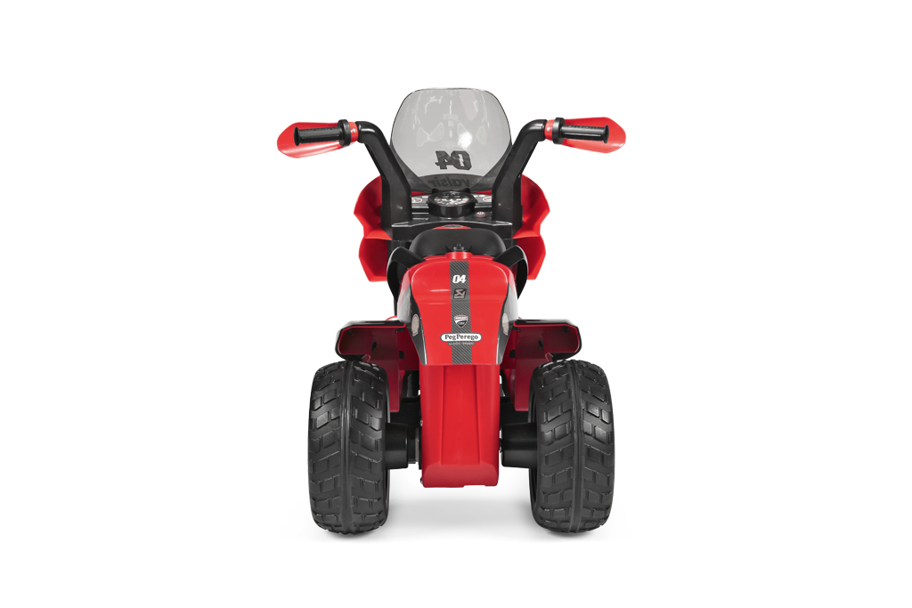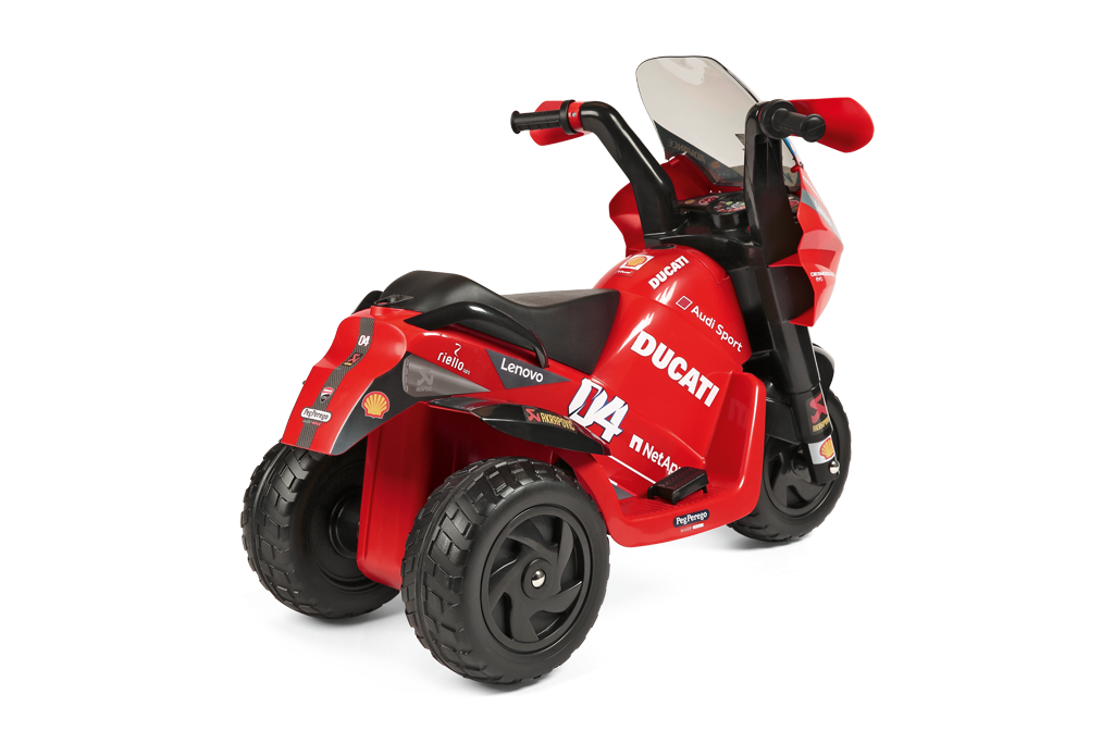 The legendary Ducati Desmosedici Evo - for Ducati bikers of the future. This all-Italian gem shows its extraordinary "EVOlution" with its even higher-performing characteristics. Lights, sounds, music and a horn, for great fun from the age of 2. The electric motorcycle operates with a 6V/4.5Ah/25Wh rechargeable battery.