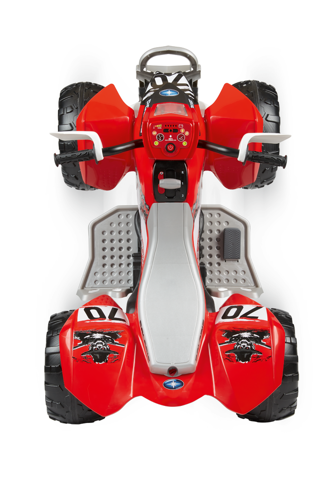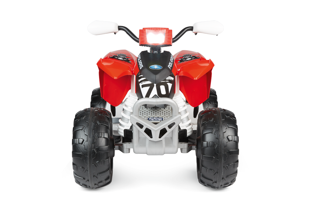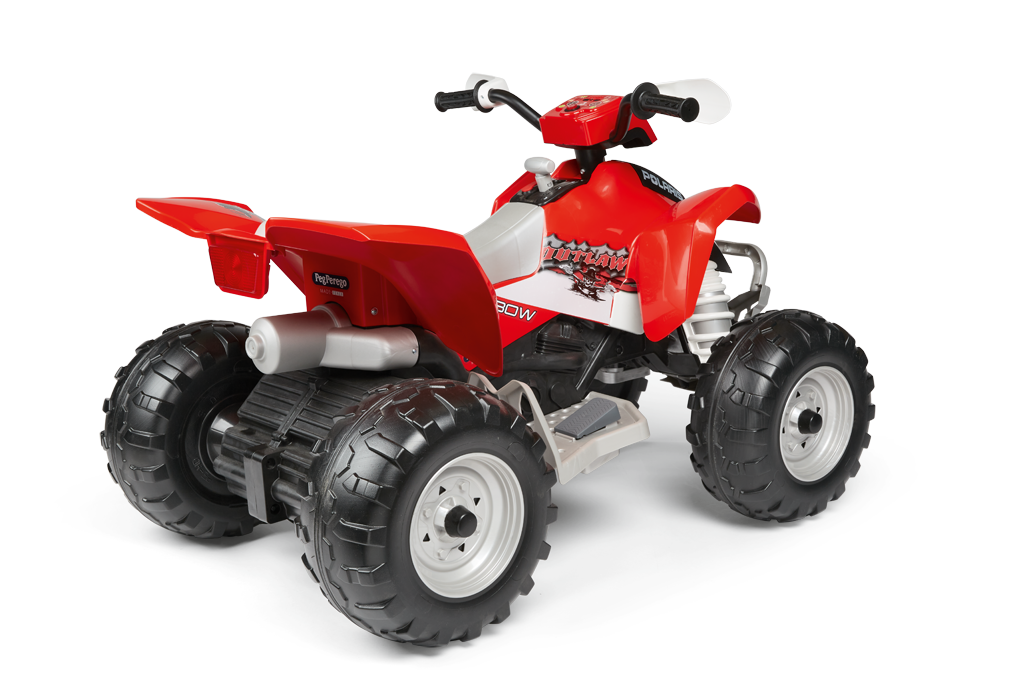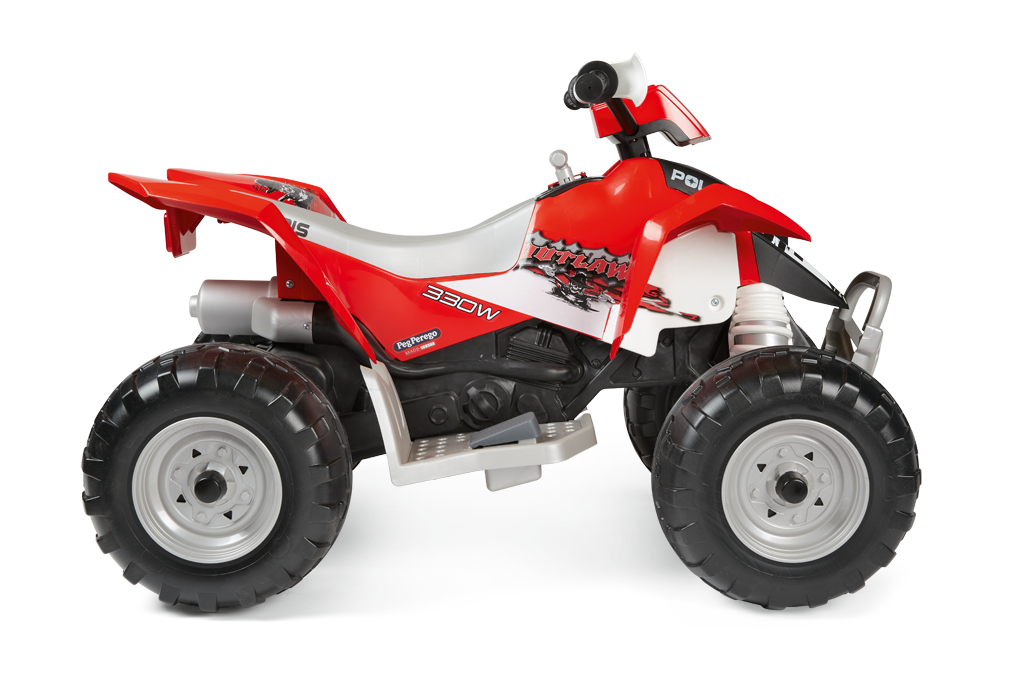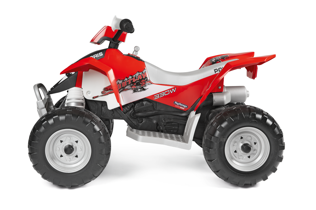Polaris Outlaw 330W is always ready for new adventures. And what adventures! AlI-Italian quality and high-performing characteristics such as lights, sounds, tunes and a horn, for great fun from the age of 3. The Peg Perego electric quad operates with a 12 V/8Ah/100 Wh rechargeable battery.