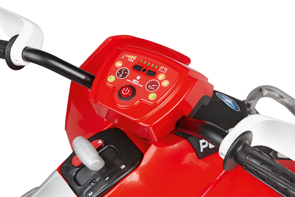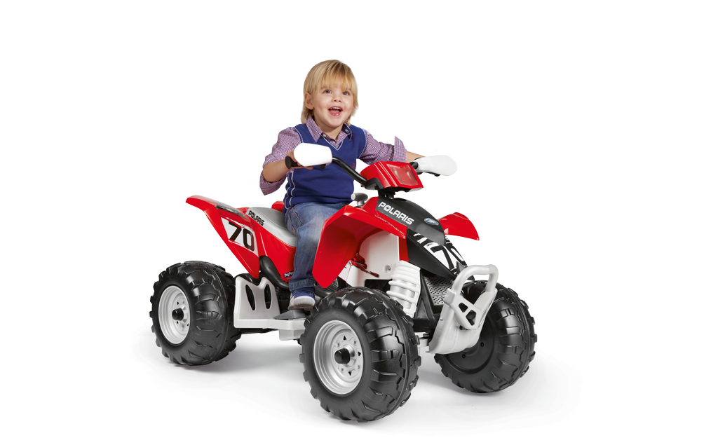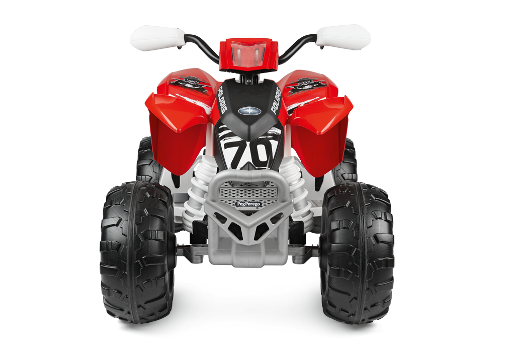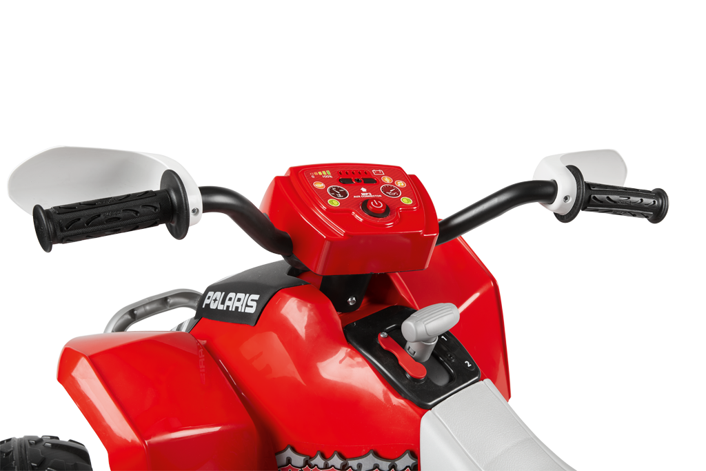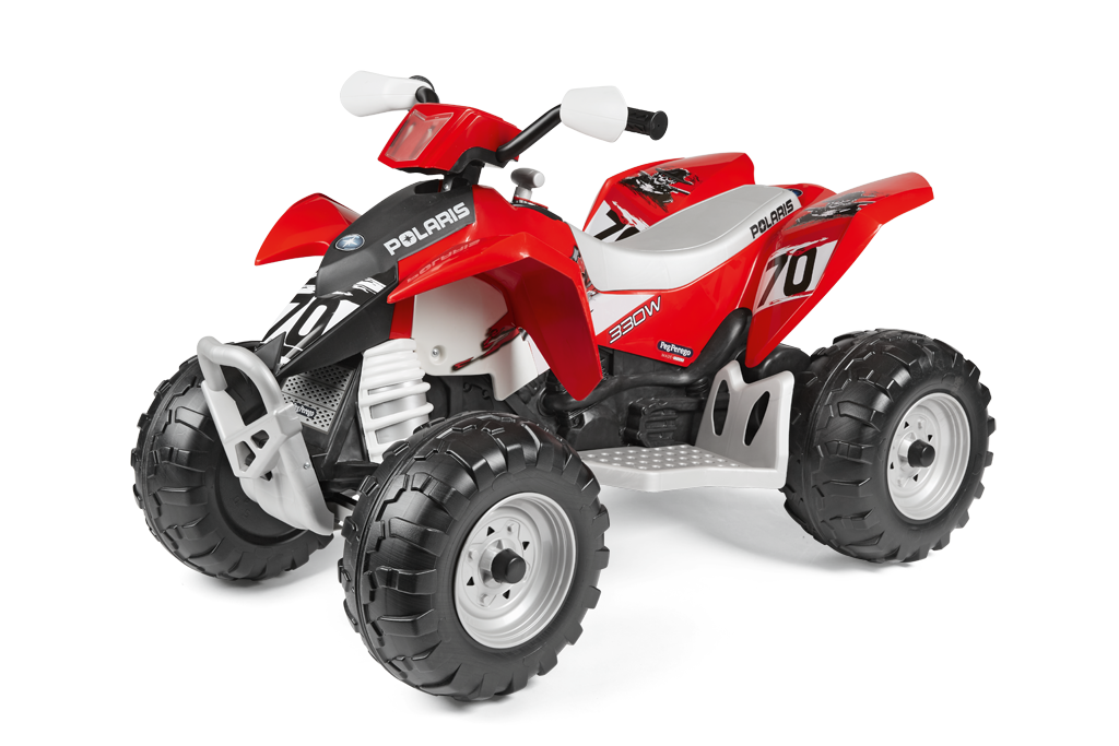 Polaris Outlaw 330W is always ready for new adventures. And what adventures! AlI-Italian quality and high-performing characteristics such as lights, sounds, tunes and a horn, for great fun from the age of 3. The Peg Perego electric quad operates with a 12 V/8Ah/100 Wh rechargeable battery.