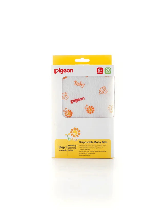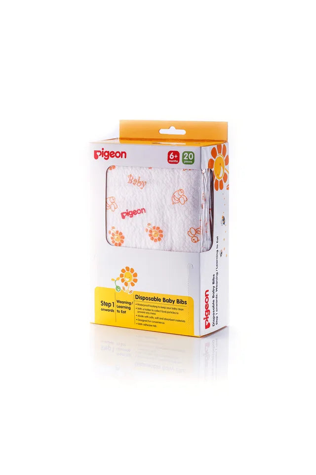 Pigeon introduces Disposable Baby Bibs to keep babies clean during mealtimes while providing convenience to mothers. Disposable Baby Bibs Features Made of ultra-absorbent, quilted material with waterproof backing Comes with self-adhesive tab at the back of the bib for easy fitting and adjustment Soft material will not hurt baby's neck, making it light, easy to apply and comfortable to wear Designed with front crumb pocket to keep baby free from food crumbs Safe - as our bibs are required to pass toxic and hygienic tests under EN71-10 standard before being released for sale Comes in resealable box for the convenient and hygiene safe-keeping