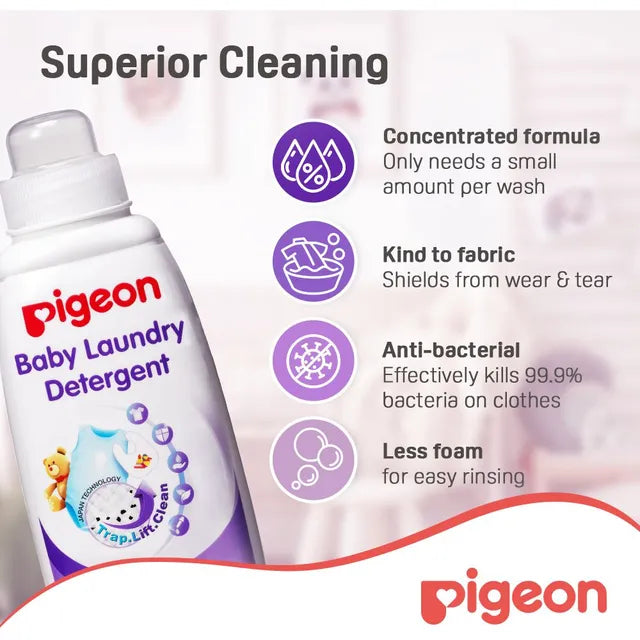 Pigeon Baby Multifunction Laundry Detergent Pigeon Laundry detergent is babsed on 3 actions - Cleans & Brightens, Colour Protection and Care for Textle fibers. Plan extracts effectively cleans variety of stains by protecting the fabric against wear & tear caused by washing. Mild on your hands and alcohol free Safe on your baby's skin Easy to rinse