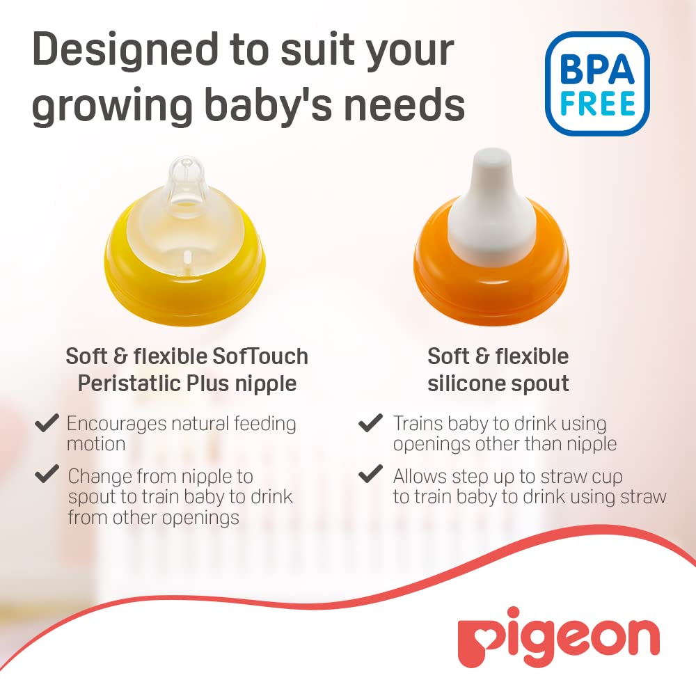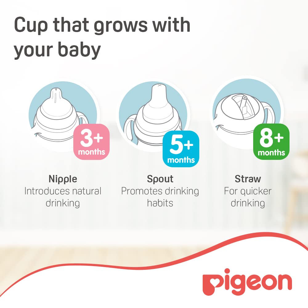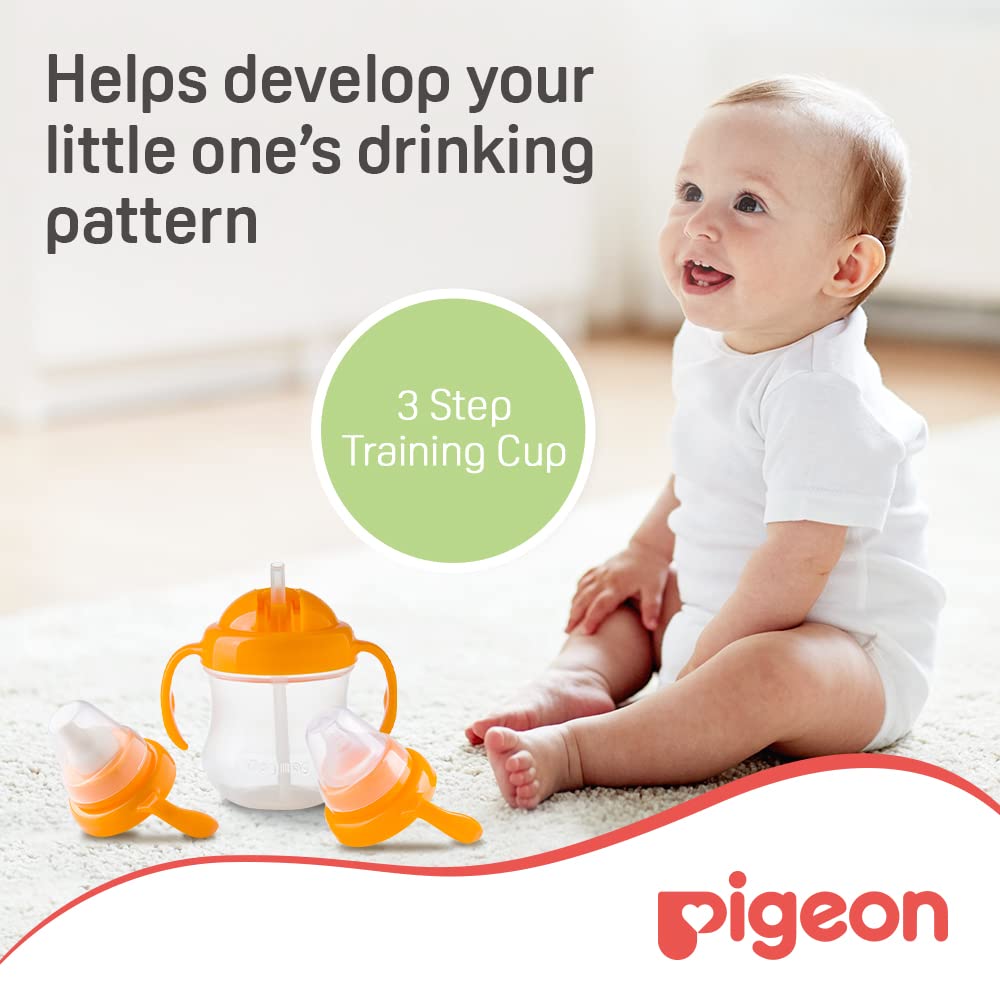 Step 1: Nipple Cup Transits from breastfeeding to bottle-feeding by using their first training cup with handles Peristaltic PLUS M size nipple which allows the reproduction of baby's natural sucking motion Step 2: Spout Cup Soft silicone spout that trains baby to drink using openings other than nipple Step 3: Straw Cup Train them to drink using straw, just like an adult