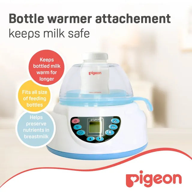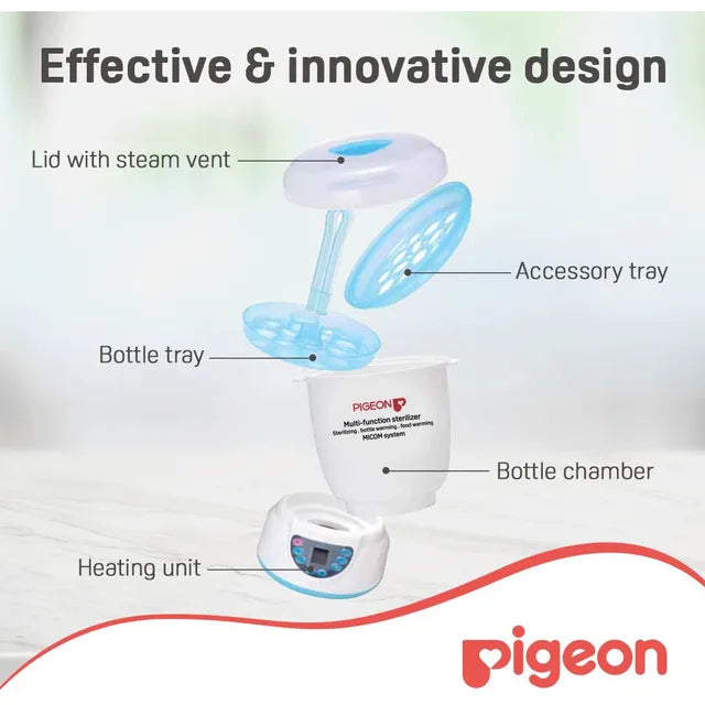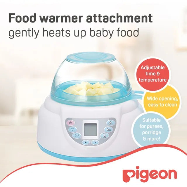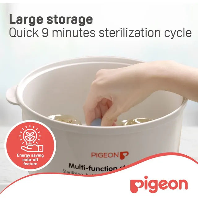 Sterilizer - water volume of 70ml Accommodates up to 5 bottles Fast Sterilization of 9 mins Food Warmer - water volume of 150ml Steamer bowl with lid for food warming Adjustable Time & Temperature Bottle Warmer - water volume of 300ml Fits all sizes of nursing bottles Adjustable Time & Temperature