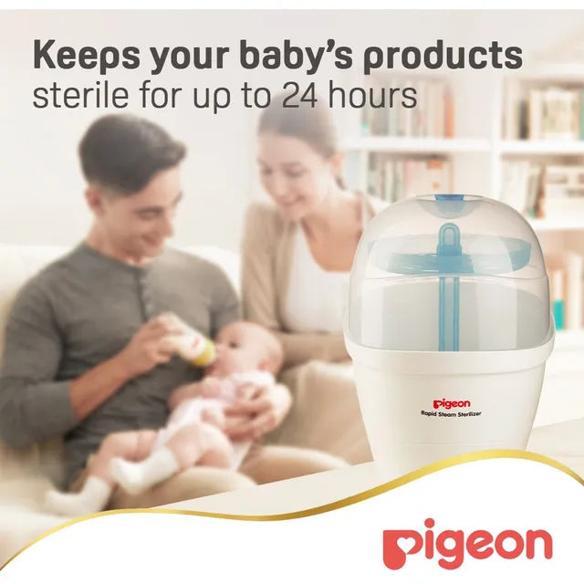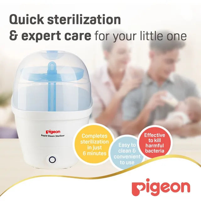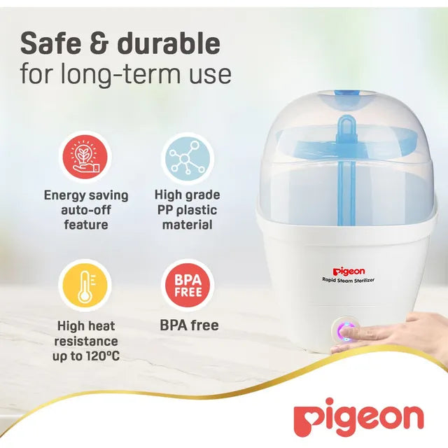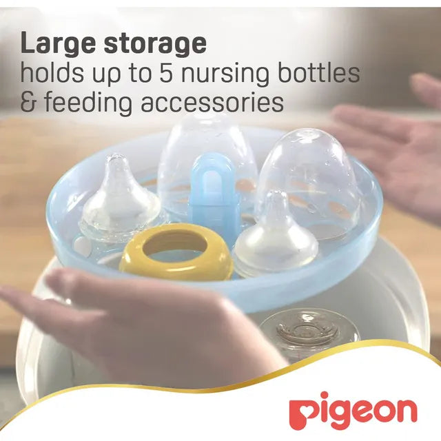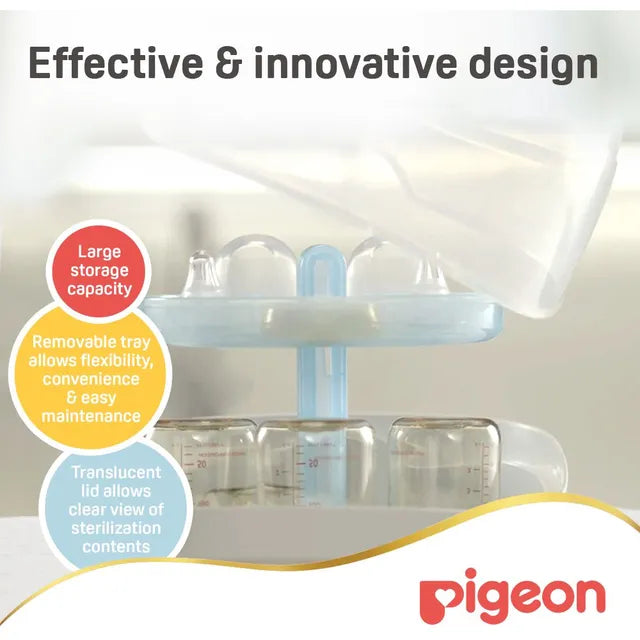 The Pigeon Rapid Steam Sterilizer with G-Type Plug has fast 6 minutes sterilization cycle. It has large storage capacity that can hold up to 5 nursing bottles & accessories. This product is microbiologically proven to kill harmful bacteria effectively Removable trays to allow flexibility, convenience and easy maintenance. Translucent Lid allows clear view contents inside the sterilizer. Auto switch-off feature provides extra safety while conserving energy.