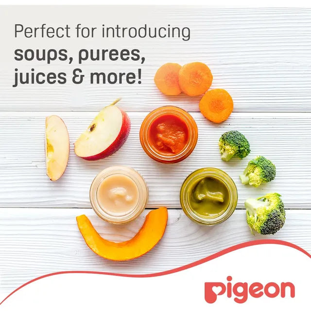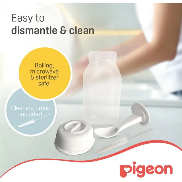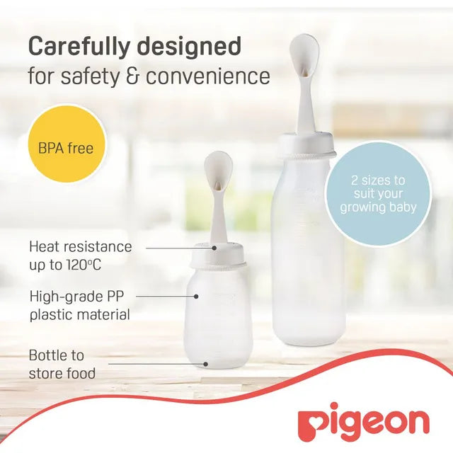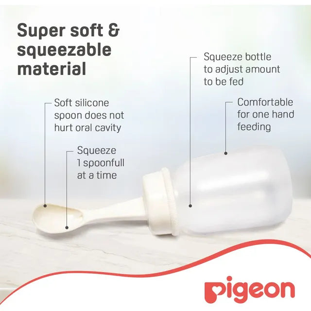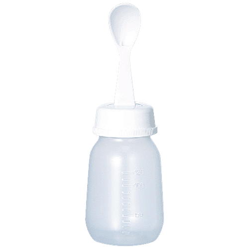 A Soft squeezable bottle with spoon helps baby learn textures and experience a spoon. It is suitable for the first stage of weaning with juice, soup or Soft solids. When you squeeze the bottle, the contents will flow slowly into the spoon. It allows you to feed easily and smoothly. Ideal for introducing baby to spoon feeding. Bottle can be sterilized. Cleaning brush is included. Also available in 120 ml.
