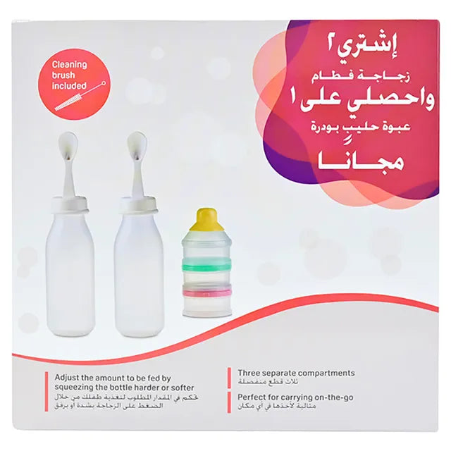 - Weaning Bottle: A soft squeezable bottle with spoon helps baby learn textures and experience a spoon.