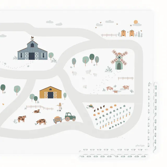 2 in 1 reversible EVA Farm puzzle playmat and storage box. Introducing a enchanting new Treehouse EVA Foam Kids Puzzlemat, designed to spark endless imagination and adventure! On one side, journey into a magical realm where whimsical treehouses tower above lush forests. Join the playful elves and mischievous goblins as they frolic among colourful balloons and friendly animals. Every corner of this captivating scene is filled with wonder and excitement, inviting little ones to embark on their own fantastical adventures.