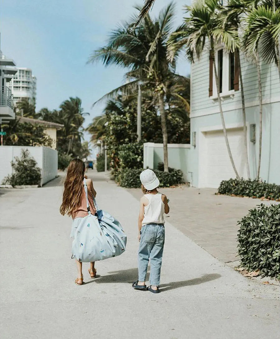 Storage Bag and Play Mat from Play & Go The unique outdoor solution for adults and kids. The PlayandGo outdoor is the unique waterproof solution to take all your needs with you for going a day to the beach, going to the park or having a great picnic. Lay it out for a place to sit or play on it. If the ground is wet you definitely stay dry. Time to go? Simply pull on the rope and everything is gathered neatly into it. The adjustable shoulder strap makes it more easily to carry and also provided with a sand/dirt escape hole so not extra kg's to carry.  The PlayandGo toy storage bag measures 140 cm in diameter and is made from quality soft PU laminated polyester.
