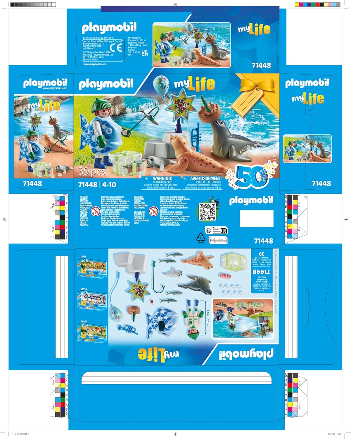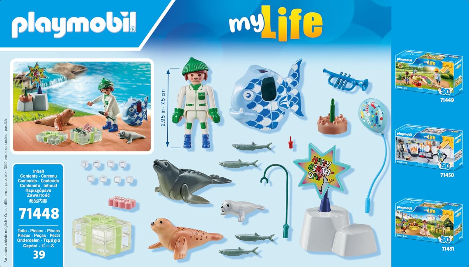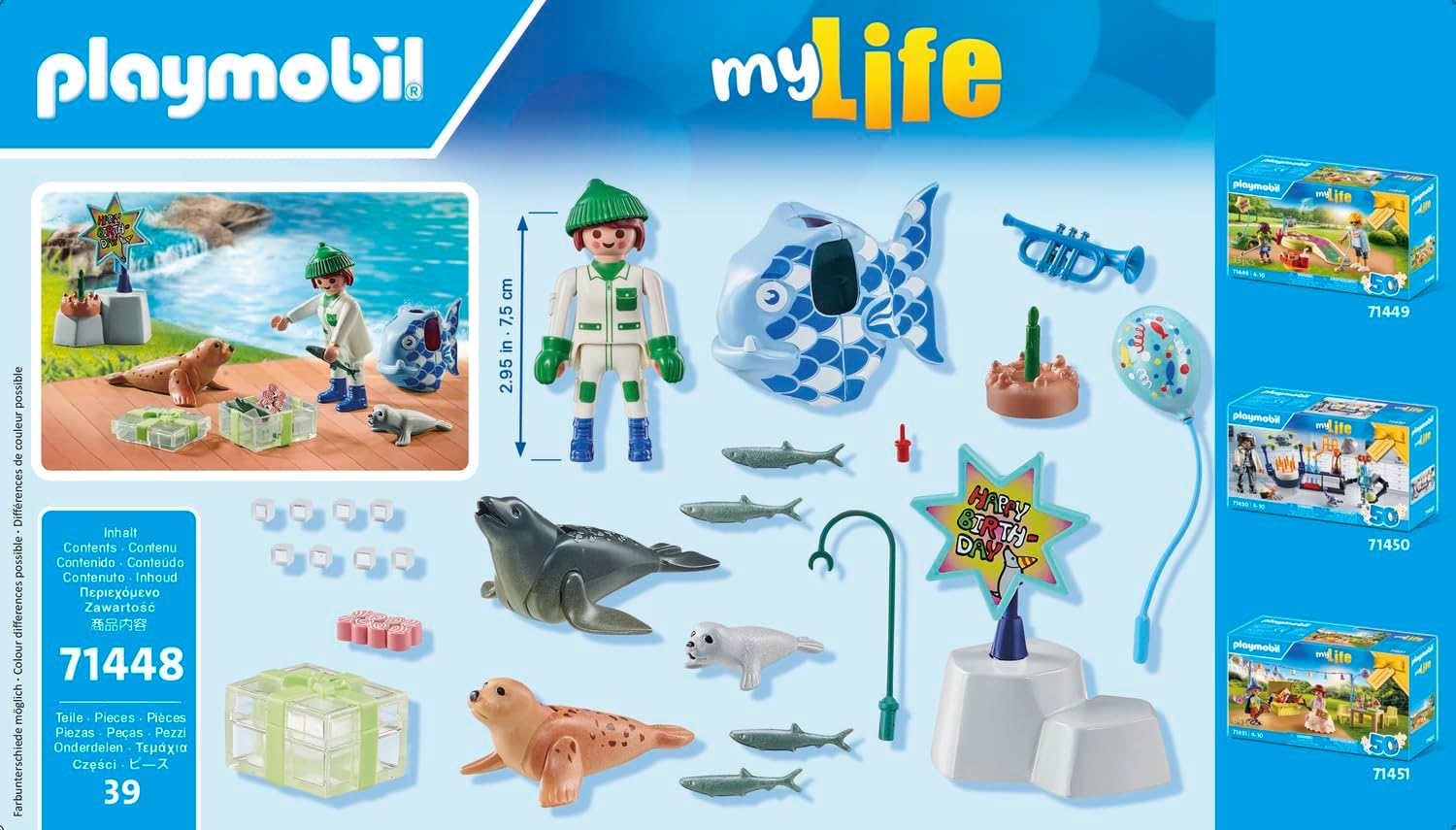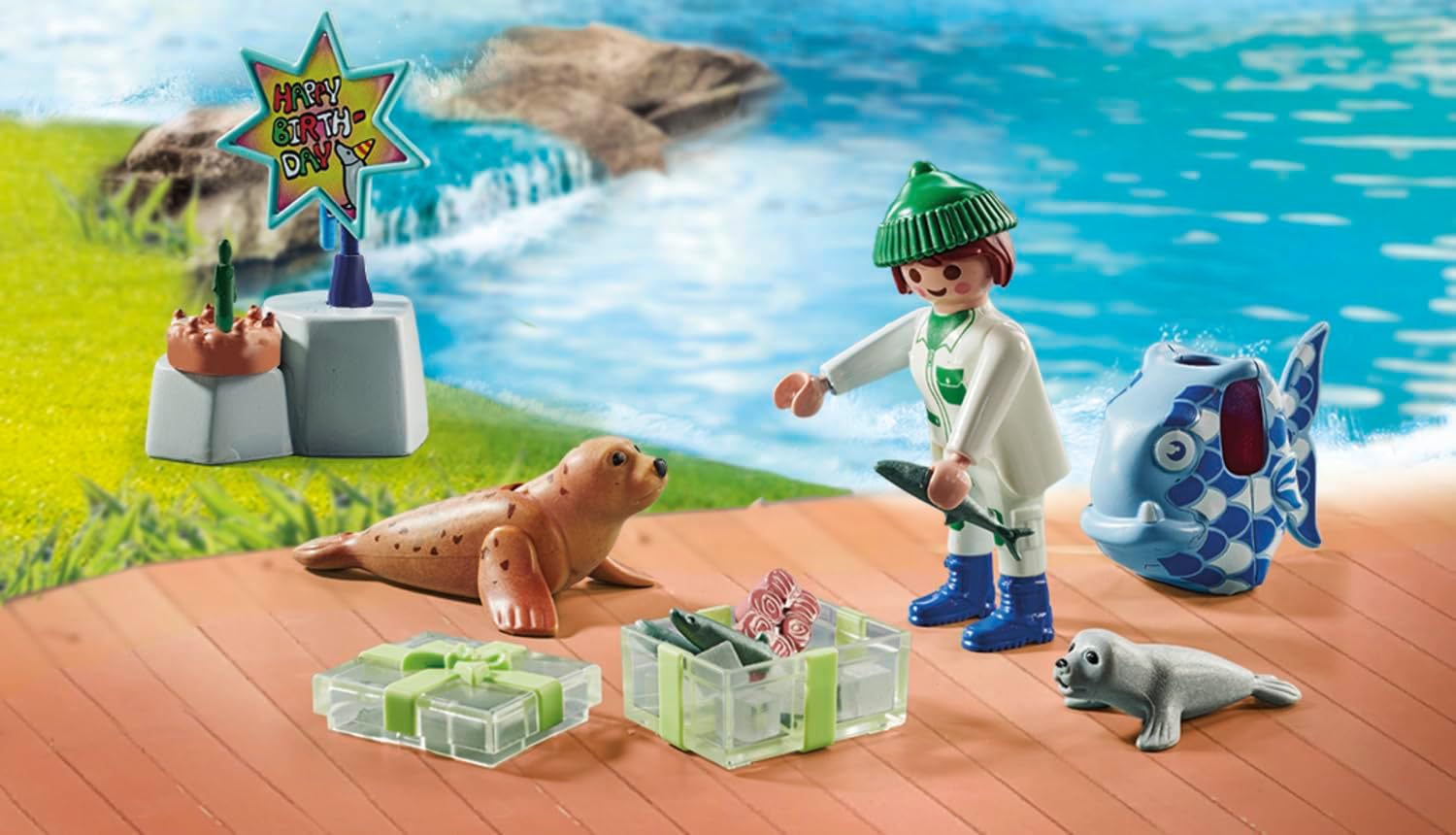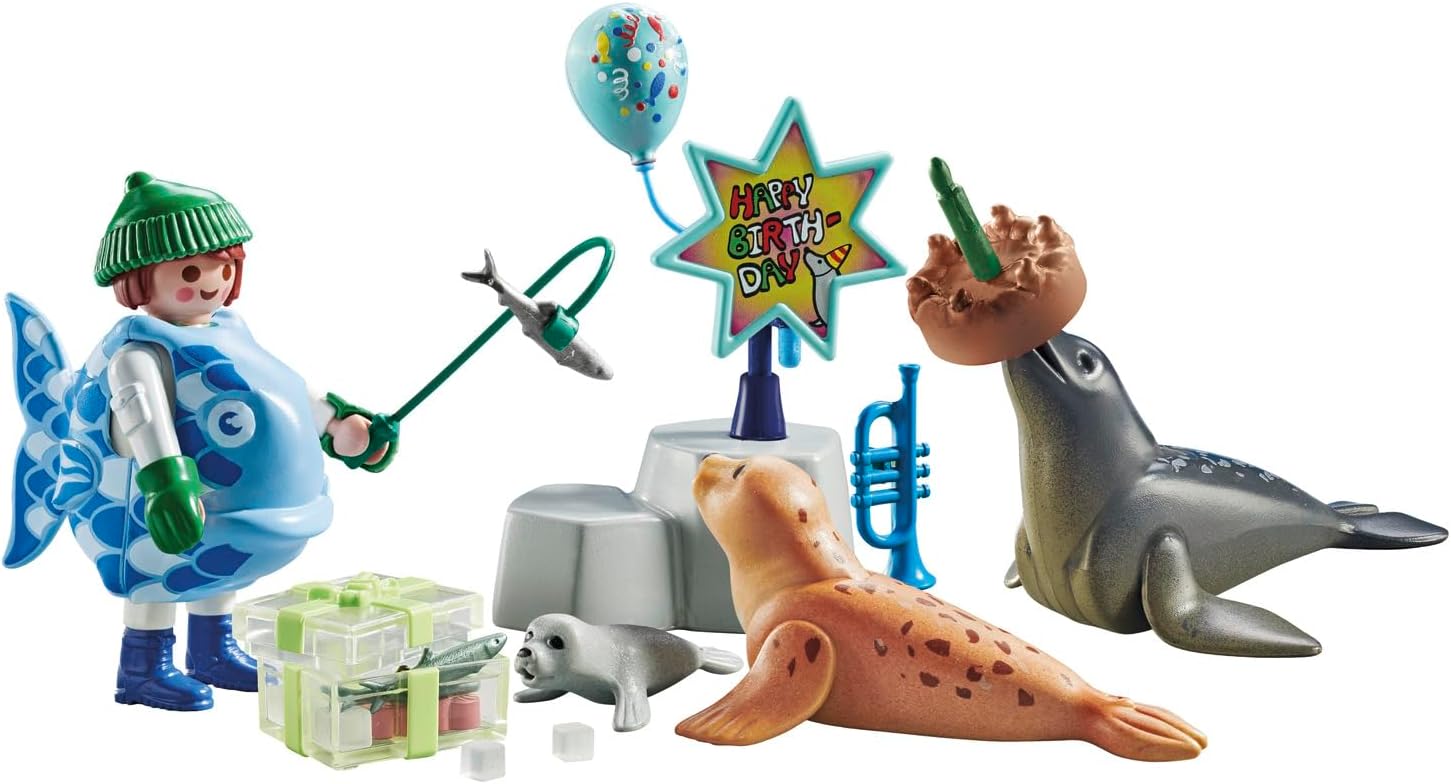 Dive into a celebration with the Playmobil Animal Feeding playset! This enchanting "party in a box" gift set is all about fun with adorable aquatic animals. An enthusiastic animal keeper, dressed in a fun fish costume, is ready to celebrate with her favorite sea creatures. The set includes a sea lion and two seals that have movable heads and flippers for realistic play. Watch the sea lion show off his skills by balancing a birthday cake on his nose with the help of a special adapter. The keeper uses a fishing rod to feed the animals from a cooler filled with fish. This set is perfect for imaginative play, allowing children to create their own animal shows, birthday celebrations, and heartwarming stories of caring for sea life.