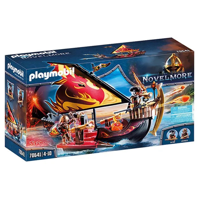 Bayron Burnham and Archibald Blazebow board the Burnham Raiders Fire Ship to continue the battle for control of the Invincibus! The floating fire ship is equipped with two swiveling cannons to launch fire arrows to protect themselves from attacks across the waters. The ship's cannons and multi-functional bow arm, which works as both a battering ram and grappling hook, protect the warriors during battle. Turn the ball in the fire bowl to display a world map or a compass to keep the ship sailing in the right direction. Set includes Bayron and Archibald from the Burnham Raiders army, fire ship, four fire arrows, armor, and many more accessories. Compatible for the Playmobil Underwater Motor (#7350 - sold separately). Recommended for ages four to ten years.Warning. Choking Hazard. Contains a small ball and small parts. Not for children under 3 years.