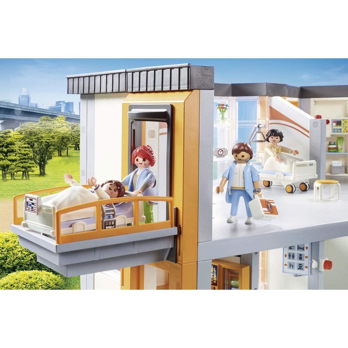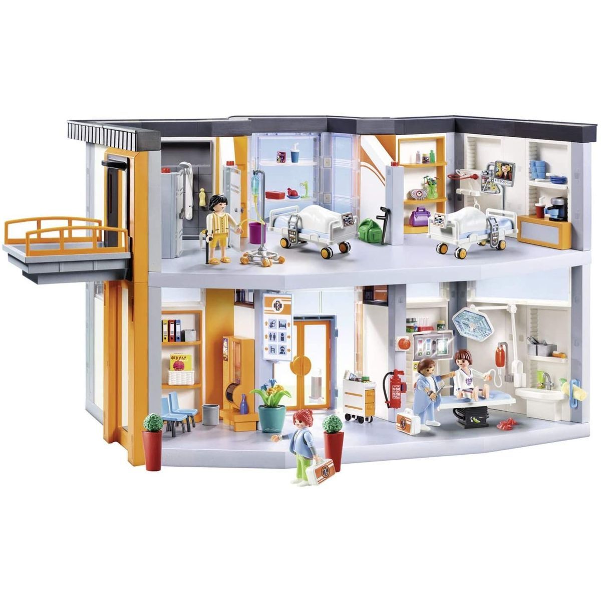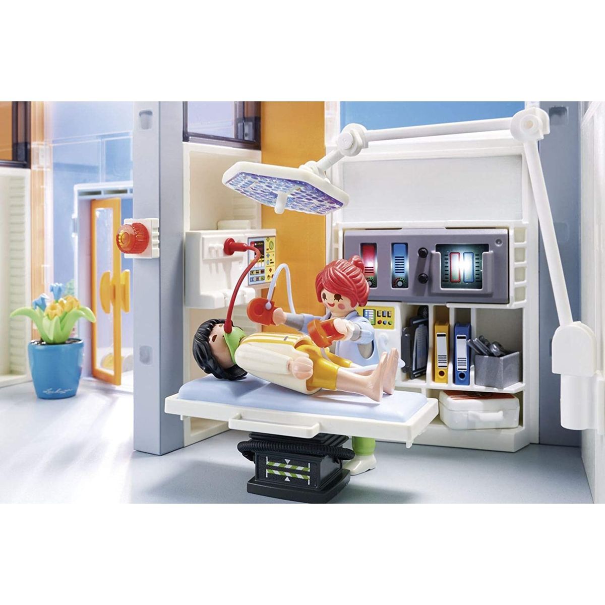 Set includes four figures, hospital building, medical devices, rolling patient beds, furnishings for the patient room, medical charts, medical cart, IV pole, and many other accessories.