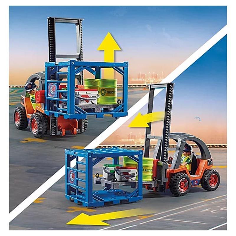 Port Playmobil is full of activities! The freighter has just arrived that everyone is already getting to work! The loading gantry sets up, the forklift and truck are positioned and the storage space employees make room to accommodate new containers. Customs officials are also on alert, seeming determined to search the containers that come down from the cargo ship. Did they spot anything suspicious? This forklift is very useful when carrying heavy loads! Contains two characters. Dimensions: 22 x 9 x 20 cm (L x W x H).