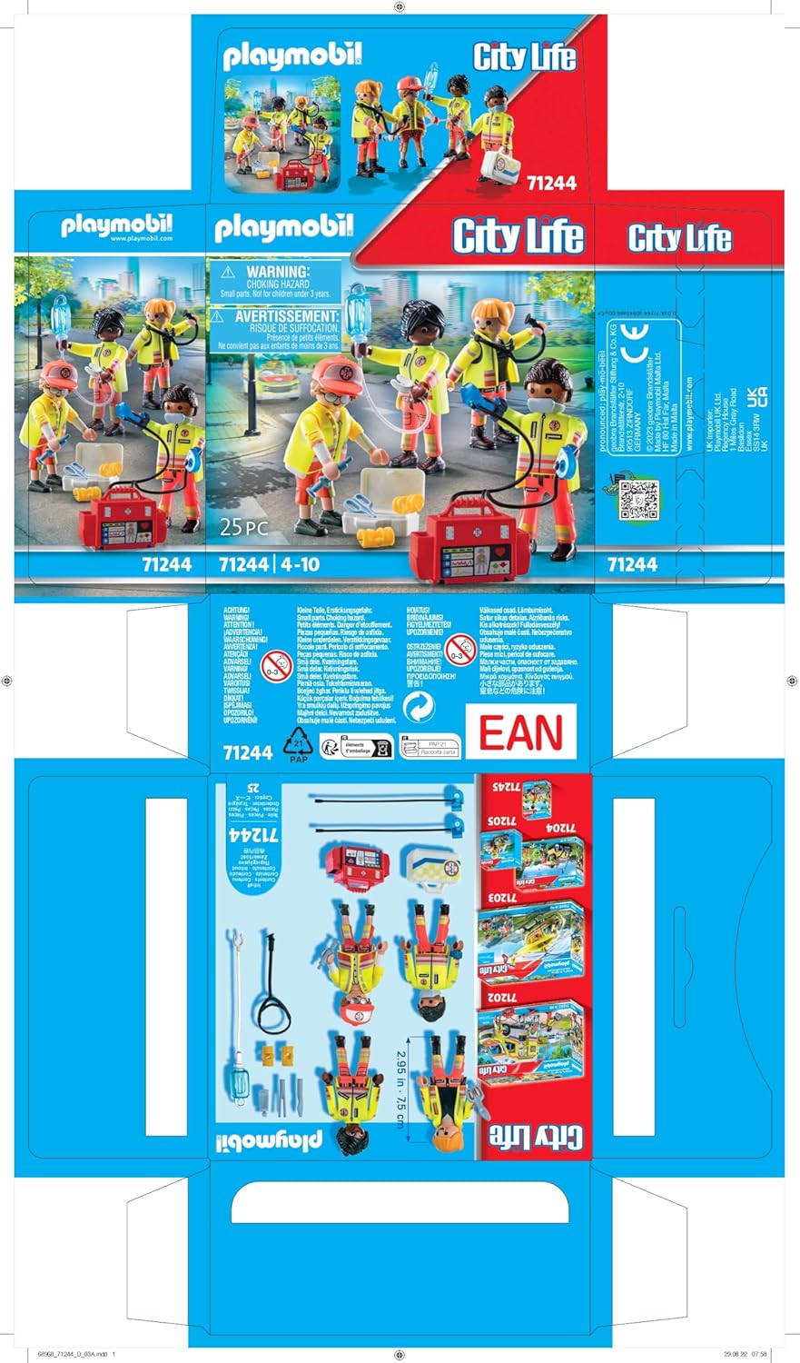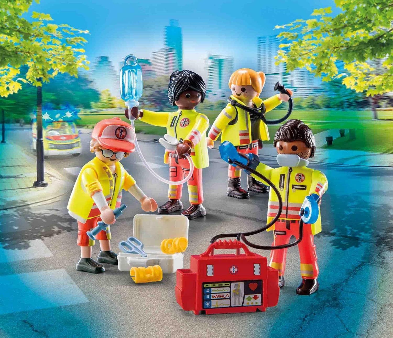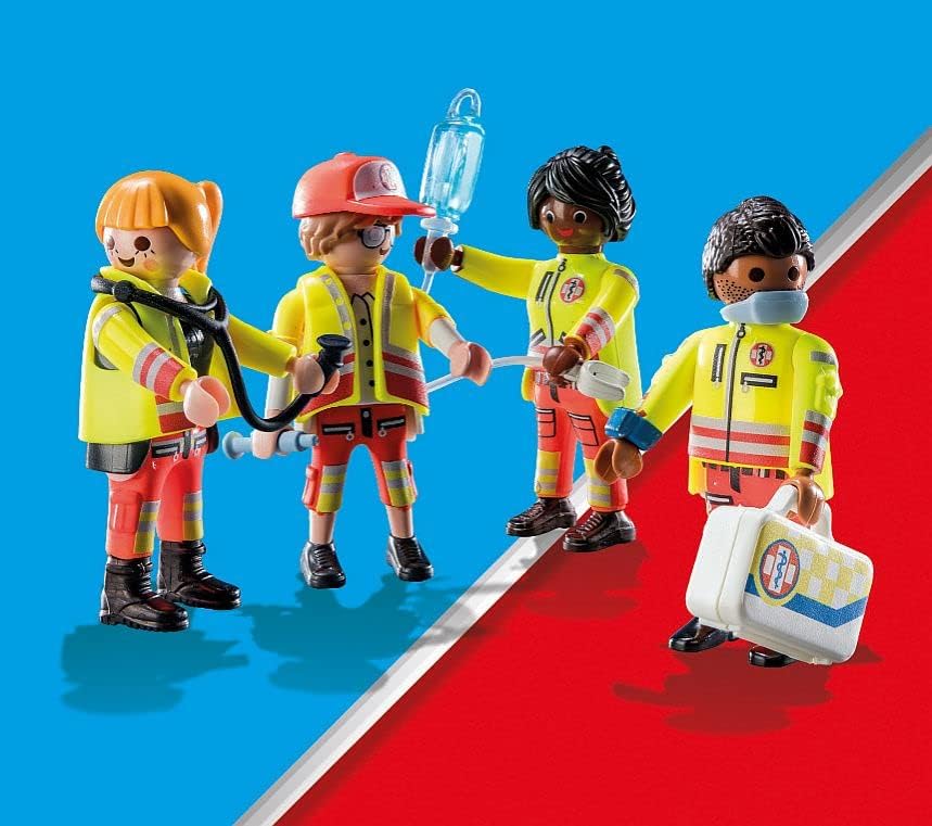 Join the Medical Team and lend a helping hand! Play with this set on its own or combine it with other Playmobil Rescue items playsets (71202-71205, 71244-71245). Set includes four figures, tool bags, stethoscope, and other accessories. Recommended for ages four to ten. Warning. Choking Hazard. Small parts. Not for children under 3 years.