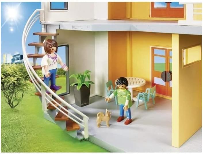 Move on in to the modern house. With five spacious rooms and a winding staircase, it’s the perfect place to call home. Spend some time grilling a BBQ outside on the patio or relax on your balcony. Working doorbell and overhead entry light make it easy for you to greet your guests. (2 x AA batteries required.) don’t forget to check the mailbox each day for letters from friends and family. Decorate your space with the different add-on rooms (sets 9267-9272 - each sold separately.) set includes two figures, dog, grill with food, lounge chair, table and chairs, LECHUZA plant, utensils, and lots of other accessories. Recommended for ages four to ten.