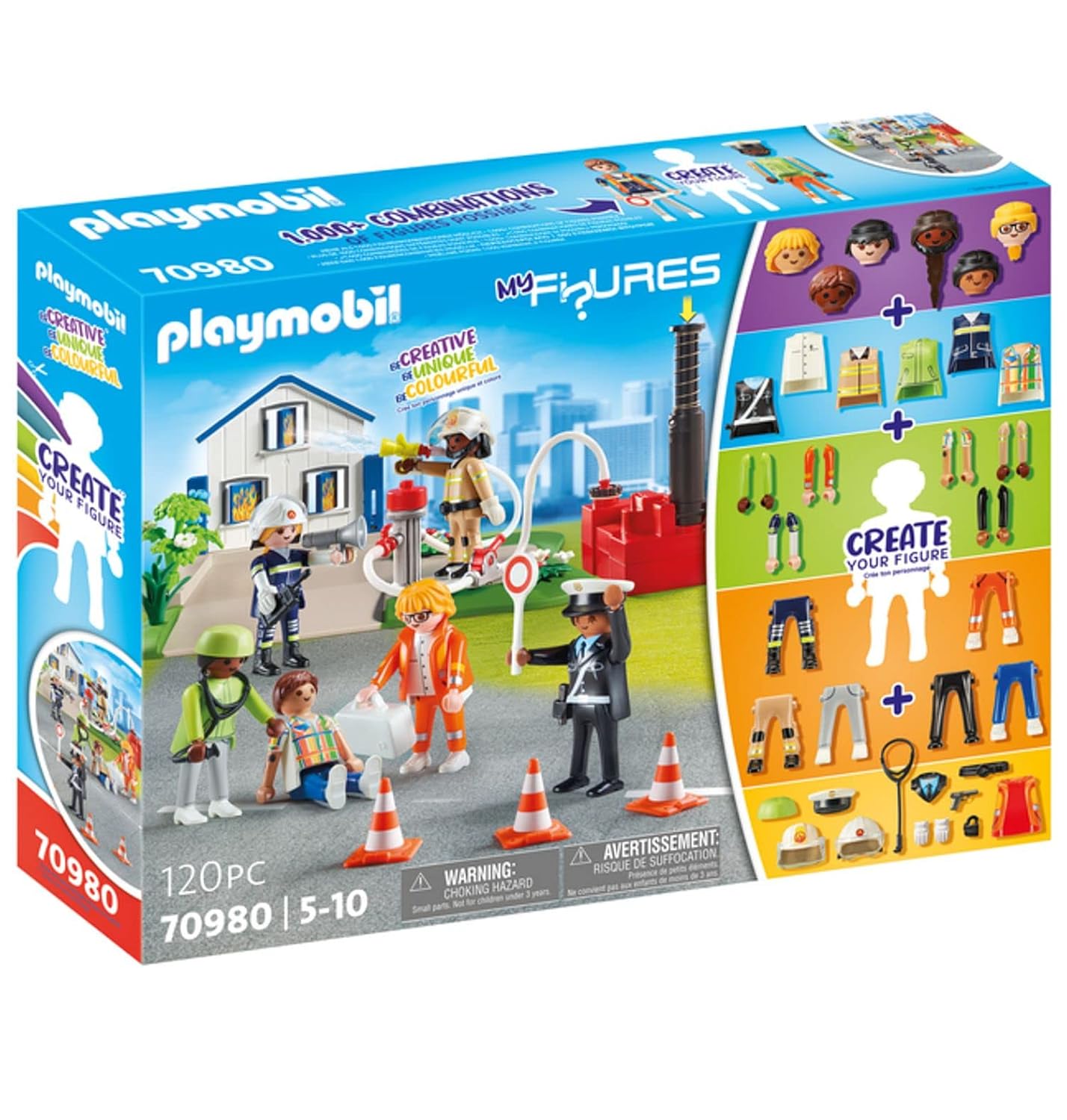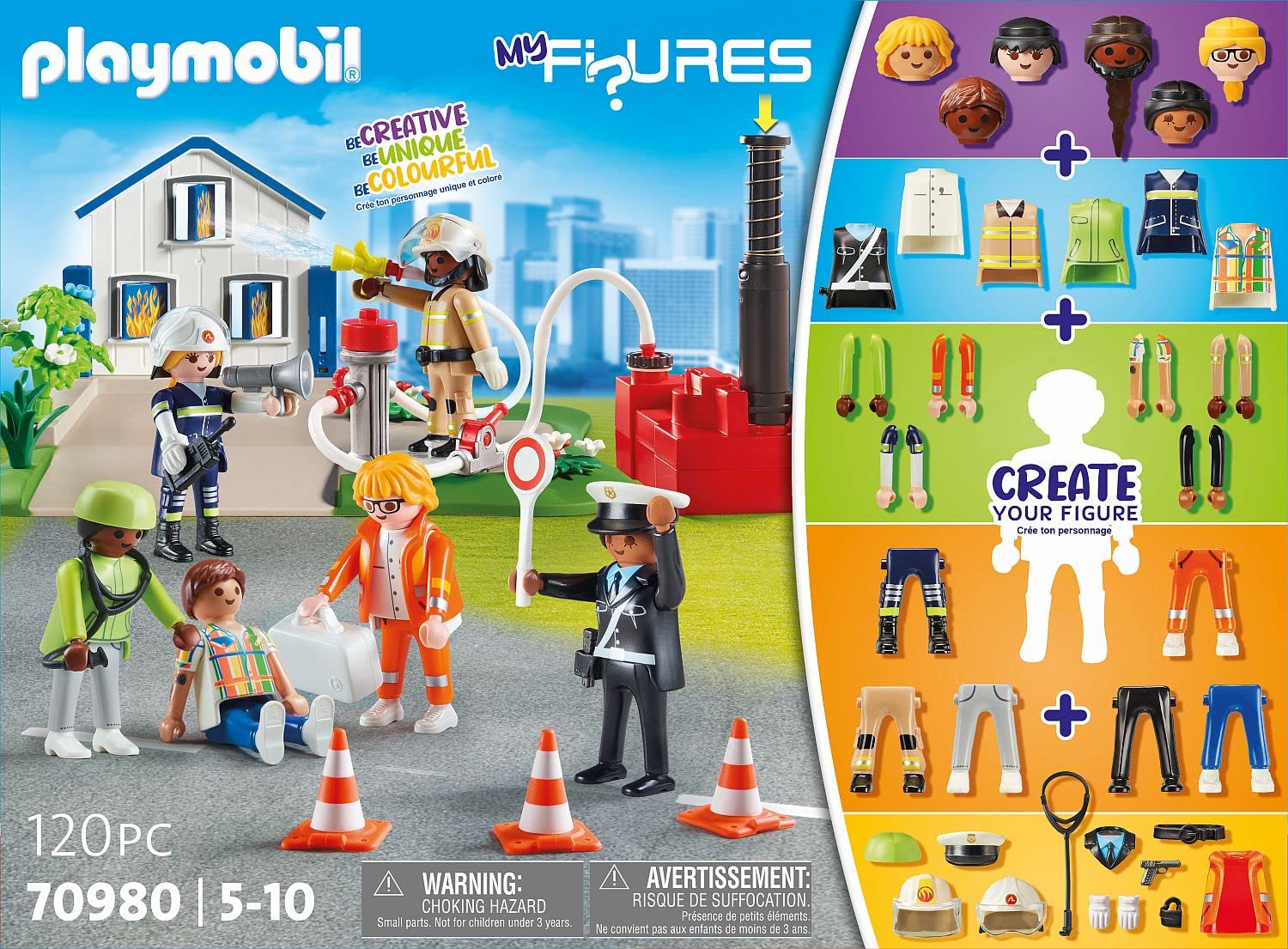 - Box contents: 1 x Playmobil My Figures: Rescue Mission, 120-piece toy figure set with instructions: accessories and accessories for 1 game scene as well as 6 Playmobil figures in individual parts (2 Playmobil policemen, 2 Playmobil fireman/woman, 2 Playmobil doctor), can be set up individually, 70980