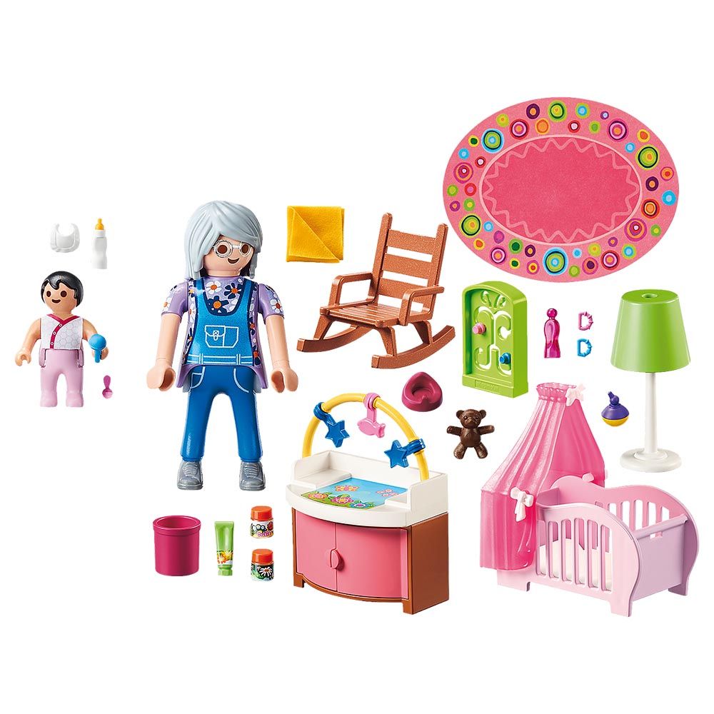 - Set includes one adult figure, one baby figure, crib, changing table, lamp, rattles, baby bottle, towels, play mat, and lots of other accessories