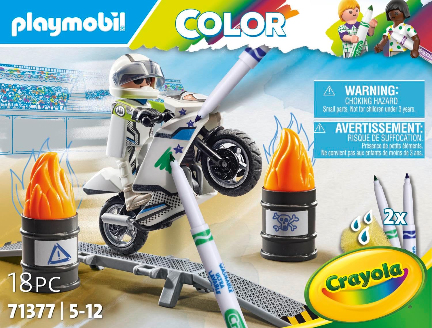 Bring color into play with Playmobil Color! Design your stunt motorcycle with the included markers according to your ideas. The white basic figure leaves maximum scope for all creative ideas. The ink washes off easily - for never-ending fun. After 45 years, the unique Playmobil Color series is making a comeback. In collaboration with the creative company CRAYOLA, five new sets are appearing with white basic figures and lots of accessories that can be individually designed and washed off again. This way, children can design their favourite figures over and over again. The customisable sets from Playmobil Color playfully encourage creativity and fine motor skills of little DIY fans. Lovers of two-wheelers can look forward to a motorcycle that can be embellished for the next stunt show. Such a vehicle is unique!
