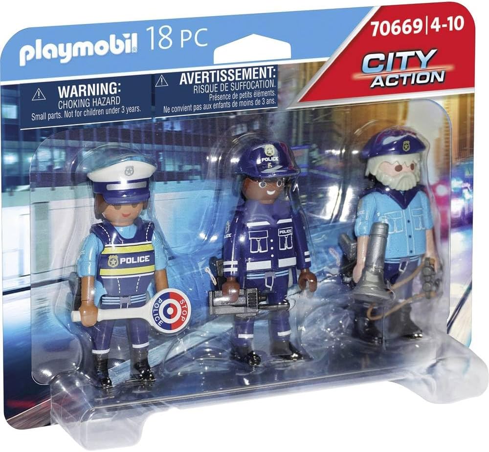 Protect and serve the community with the Police Figure Set. The officers are ready to help with any situation, whether assisting in the pursuit of a criminal or directing traffic in an emergency. Play with this set on it's own or use it to add police reinforcements to the other sets in the Playmobil Police theme (#70568-70577, 6919-6920, and 6924 - each set sold separately). Set includes three police figures, megaphone, walkie talkie, binoculars, hats, and other accessories. Recommended for ages four to ten years. Warning. Choking Hazard. Small parts. Not for children under 3 years.