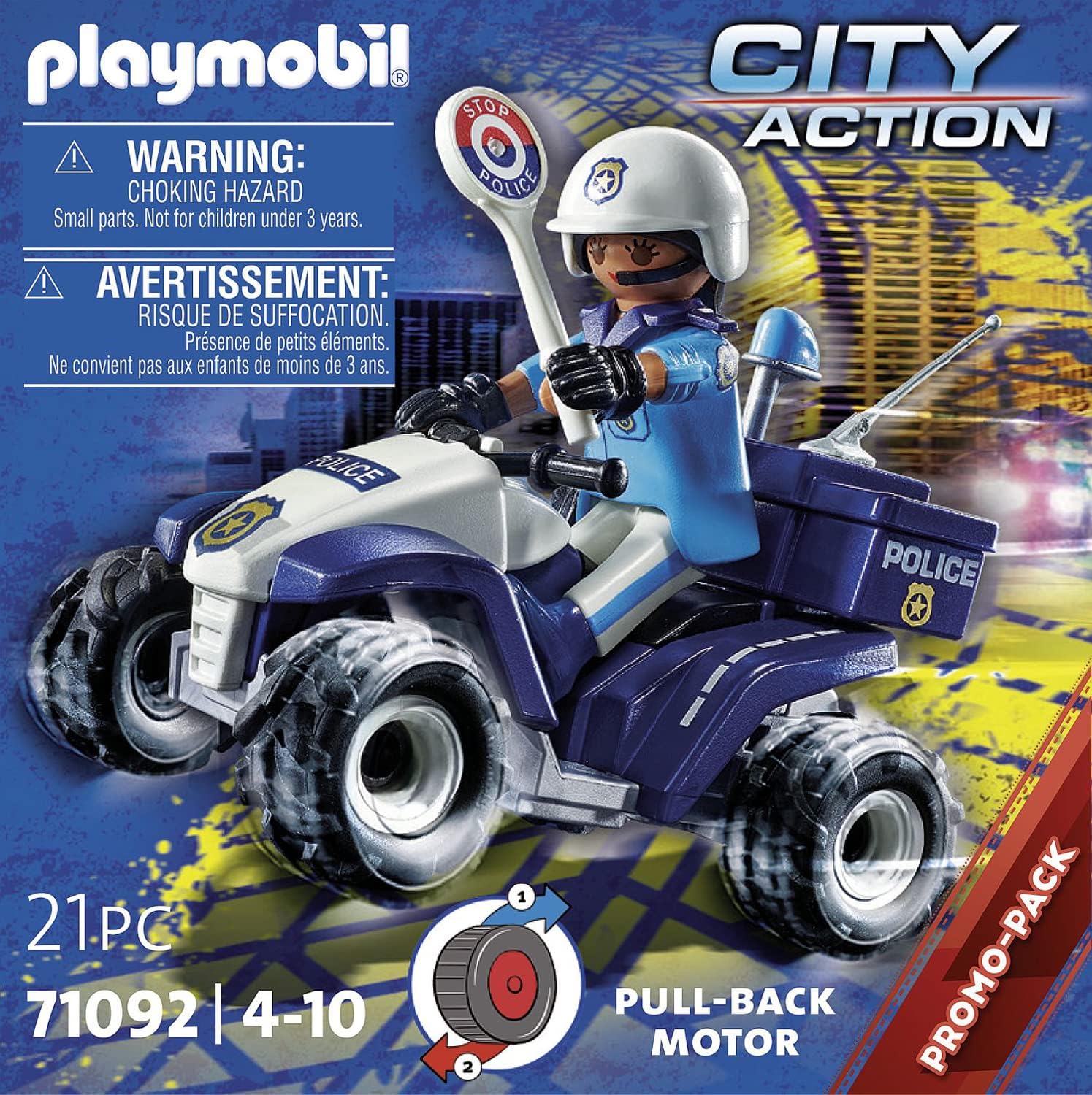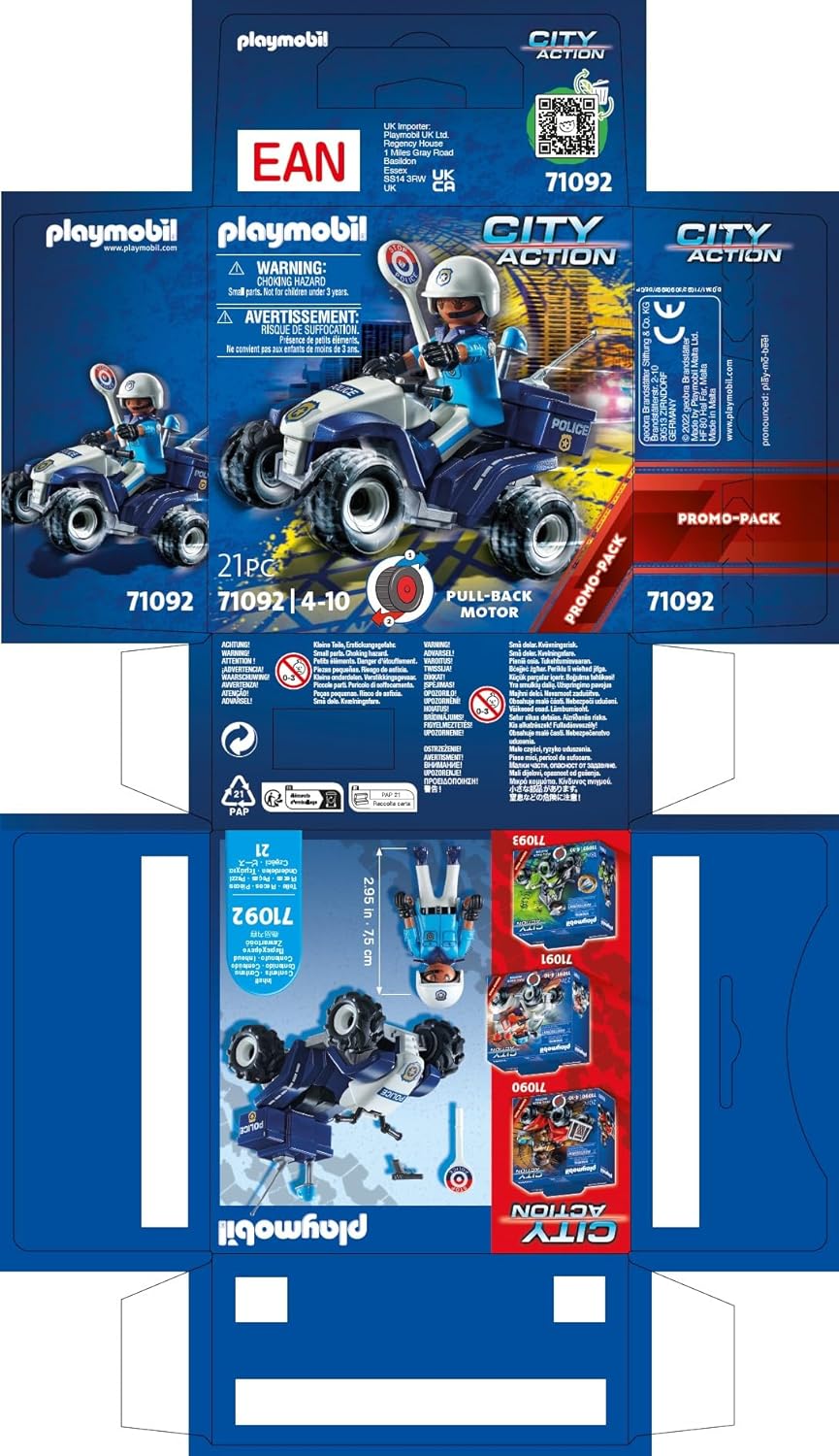 The PLAYmobil Police Quad 71092 is a fast and agile vehicle designed for exciting police chases and rescue missions. This set includes a police officer figure and accessories to help maintain law and order. The quad's maneuverability makes it perfect for patrolling various terrains and quickly responding to emergencies. With its pullback motor, the quad can speed off to the scene, adding dynamic play possibilities. This set is part of the Playmobil City Action series and is designed to spark imaginative role-playing for children aged 4 and up.