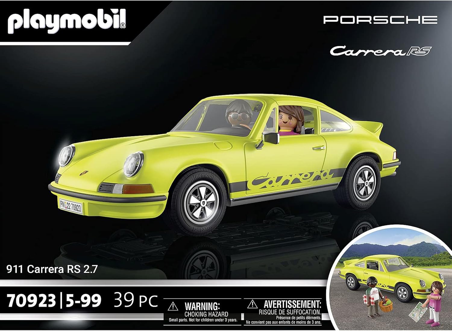 Who hasn't dreamt of owning a real Porsche? With the Porsche 911 Carrera RS 2.7, a classic nostalgic sports car is now joining the Playmobil lineup. The world's first street sports car with front and rear spoilers makes a great Playmobil model. The intricately-designed body's legendary shape features aerodynamic details and the iconic rear spoiler, better known as "Duck Tail." The rearview mirror and headlights with chrome detailing, along with the curved Carrera lettering on the side, give the classic car a special elegance. To seat the figures inside the car, simply remove the roof. Fans can also open the trunk to reveal the vehicle's 6-cylinder boxer engine. Whether it's a sporty road trip or a winding country road, every drive is an experience with the Porsche 911 Carrera RS 2.7 from PLAYMOBIL. A unique sports car model that no collection should be without! The playset includes a Porsche 911 Carrera RS 2.7 in chic yellow with removable roof and opening trunk, two Playmobil figures with picnic basket, blanket, road map, and other accessories for an unforgettable trip. The included table plaque lists the sports car's most important information. Recommended for ages five to ninety-nine years. Warning. Choking Hazard. Small parts. Not for children under 3 years.