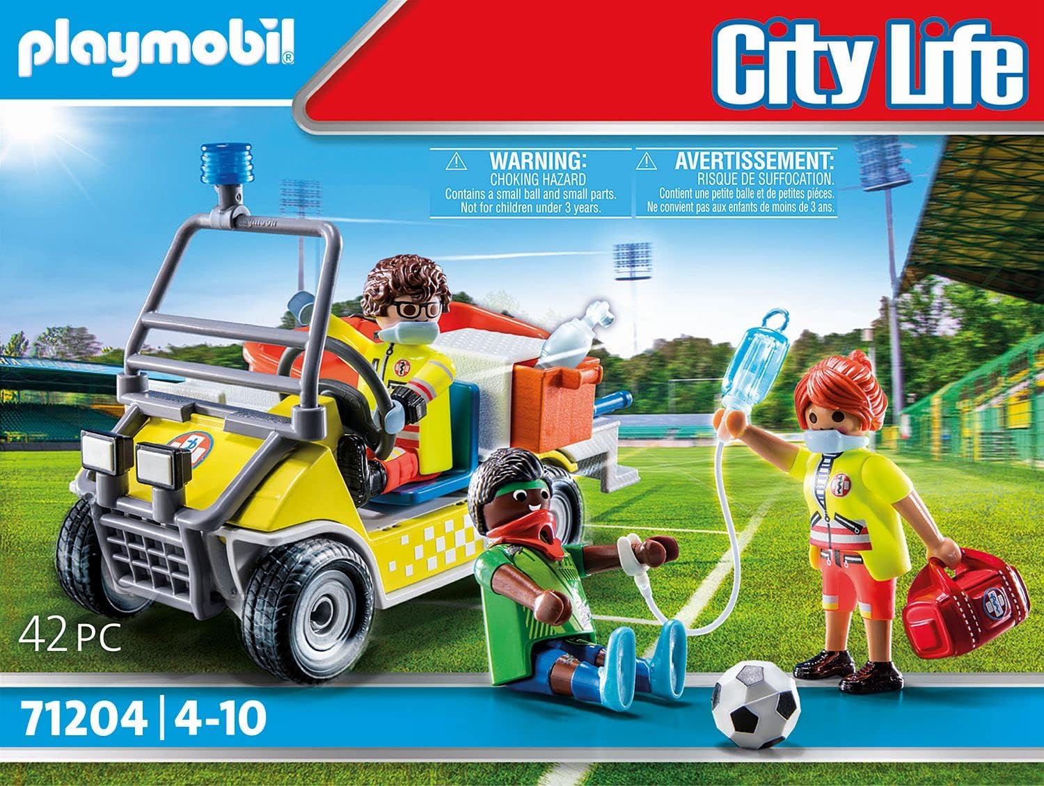 Jump into action with the Rescue Cart. Includes enough space for the driver, medic, and patient lying on a stretcher. Open the side drawer to store all the medical equipment. Play with this set on its own or combine it with other Playmobil rescue playsets (71202-71205, 71244-71245). The set includes three figures, stretcher, and other accessories. Recommended for ages four through ten. Warning. Choking Hazard. Small parts. Not for children under 3 years.