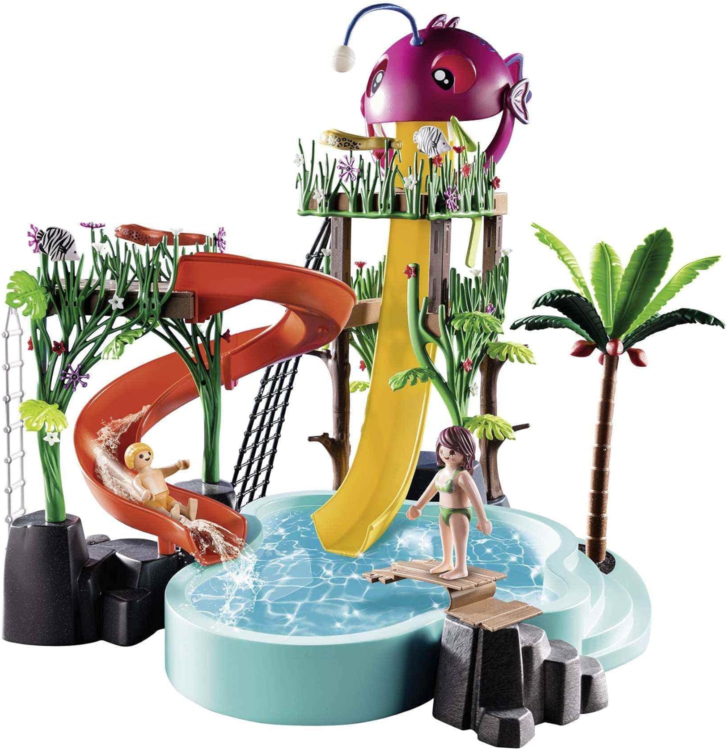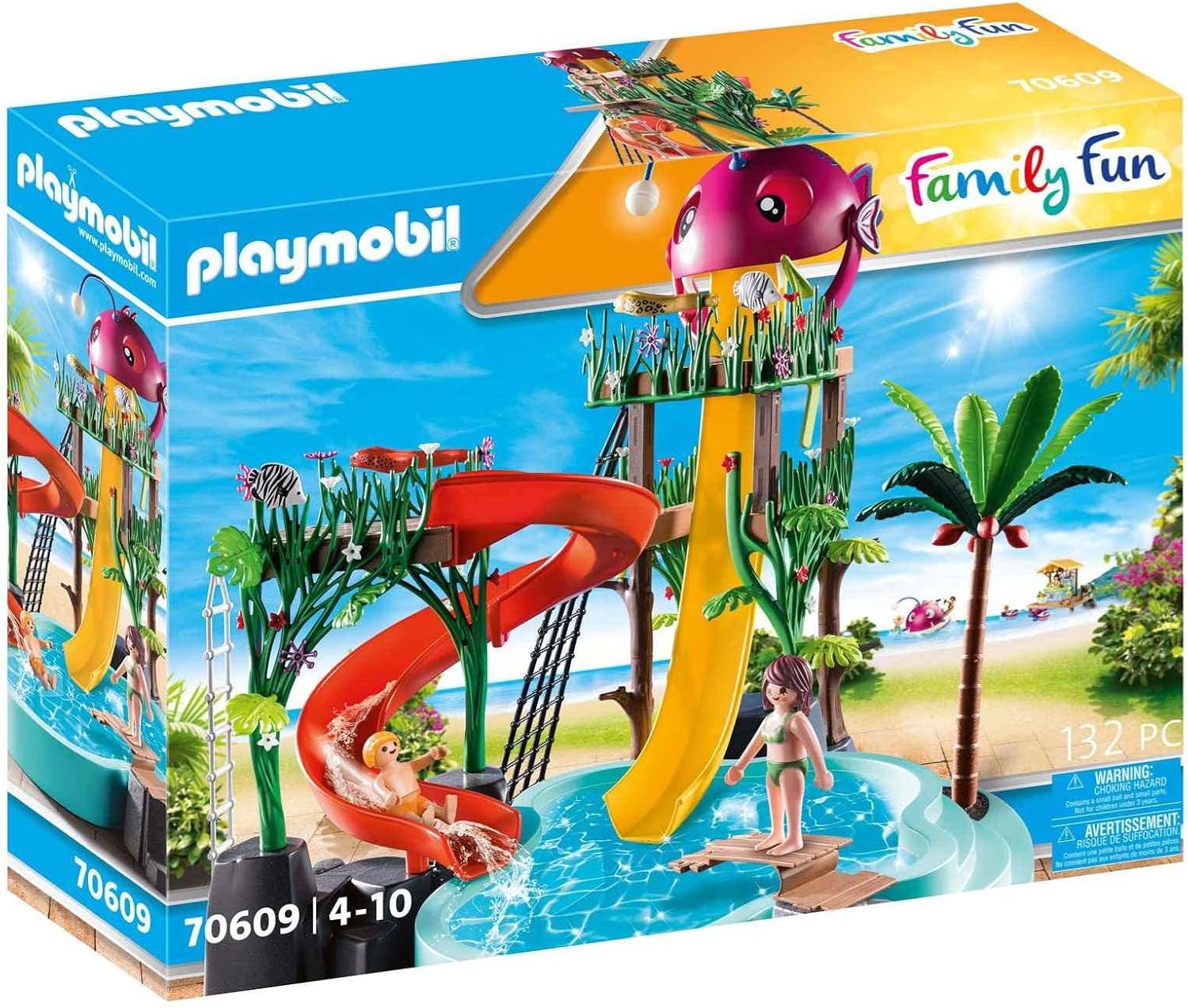 Cool off with a visit to the Water Park with Slides! Thrill seekers climb the rope to the largest tower to experience exhilarating fun on the steepest water slide. Tilt the fish forward to activate the trap door that sends the swimmer zooming down the slide! Show off your skills on the diving board or splash around in the fillable pool. The fish's glow-in-the-dark teeth and lantern allow the fun to continue after the sun goes down! For even more fun, combine with other sets in the Playmobil Water Park theme (#70609-70614 - sold separately). Set includes two figures, water park structure with slide, two eels, two fish, palm tree, and other accessories. Dimensions: 17.5 x 16.5 x 17.3 in (LxWxH). Recommended for ages four to ten years. Warning. Choking Hazard. Contains a small ball and small parts. Not for children under 3 years.