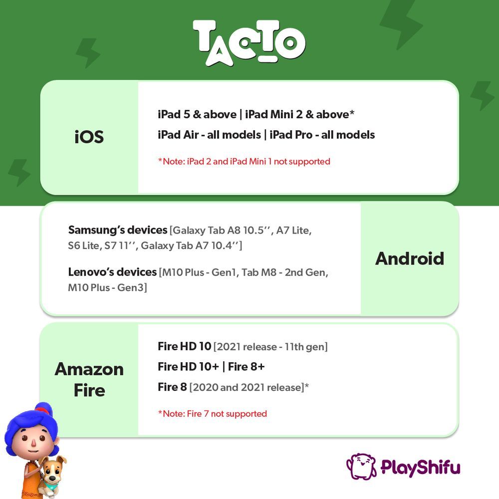 - COMPATIBLE DEVICES: Tacto works with a range of tablets: iPads 5 and above (iPad 2 and iPad Mini 1 not supported) Android tabs 7-inches and above, minimum 2GB RAM (Samsung Tab A and S7+ not supported), Fire HD 8 - 2020, Fire HD 10 - 2021(Fire 7 not supported). Tacto app is absolutely free to download from the Apple App Store or Google Play Store and works even without the internet (no ads or in-app purchases).