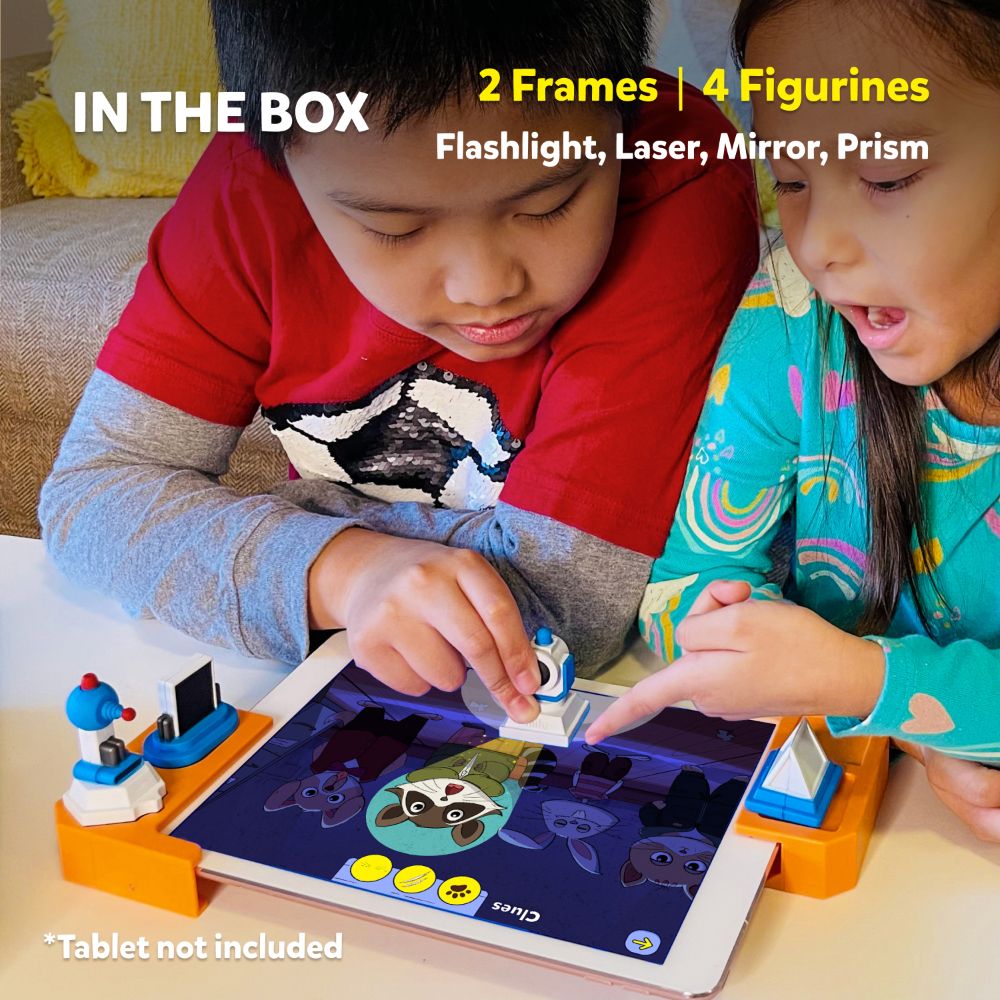 - IN THE BOX - 2 frames and 4 game pieces (1 mirror figurine, 1 prism figurine, 1 flashlight figurine, 1 laser figurine). Fix the 2 anti-slip frames on either side of your tablet. Choose a game and let the adventure begin! (The box doesn't come with a tablet/smartphone).