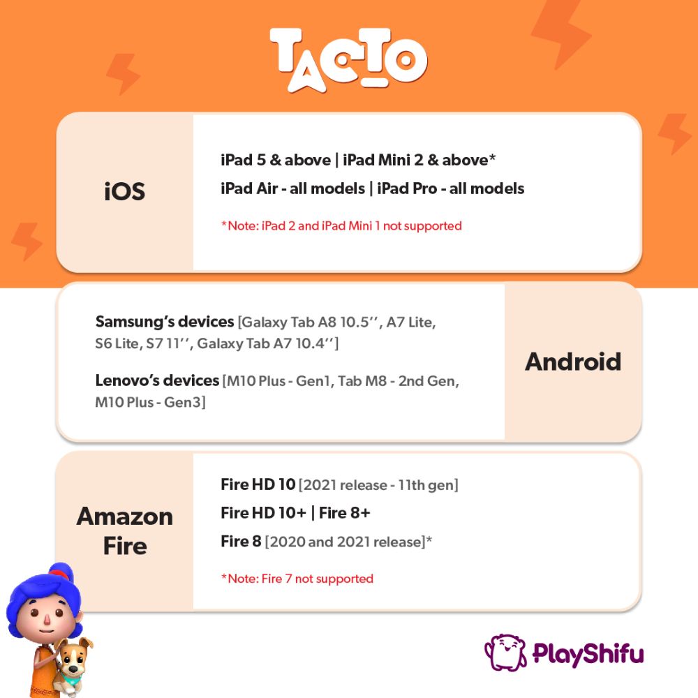 - COMPATIBLE DEVICES: Tacto works with a range of tablets: iPads 5 and above (iPad 2 and iPad Mini 1 not supported) Android tabs 7-inches and above, minimum 2GB RAM (Samsung Tab A not supported), Fire HD 8 - 2018, 2020, Fire HD 10 - 2021(Fire 7 not supported). Tacto app is absolutely free to download from the Apple App Store or Google Play Store and works even without the internet (no ads or in-app purchases).