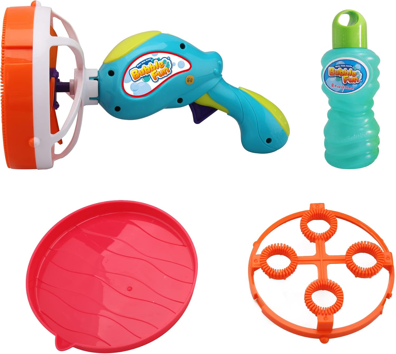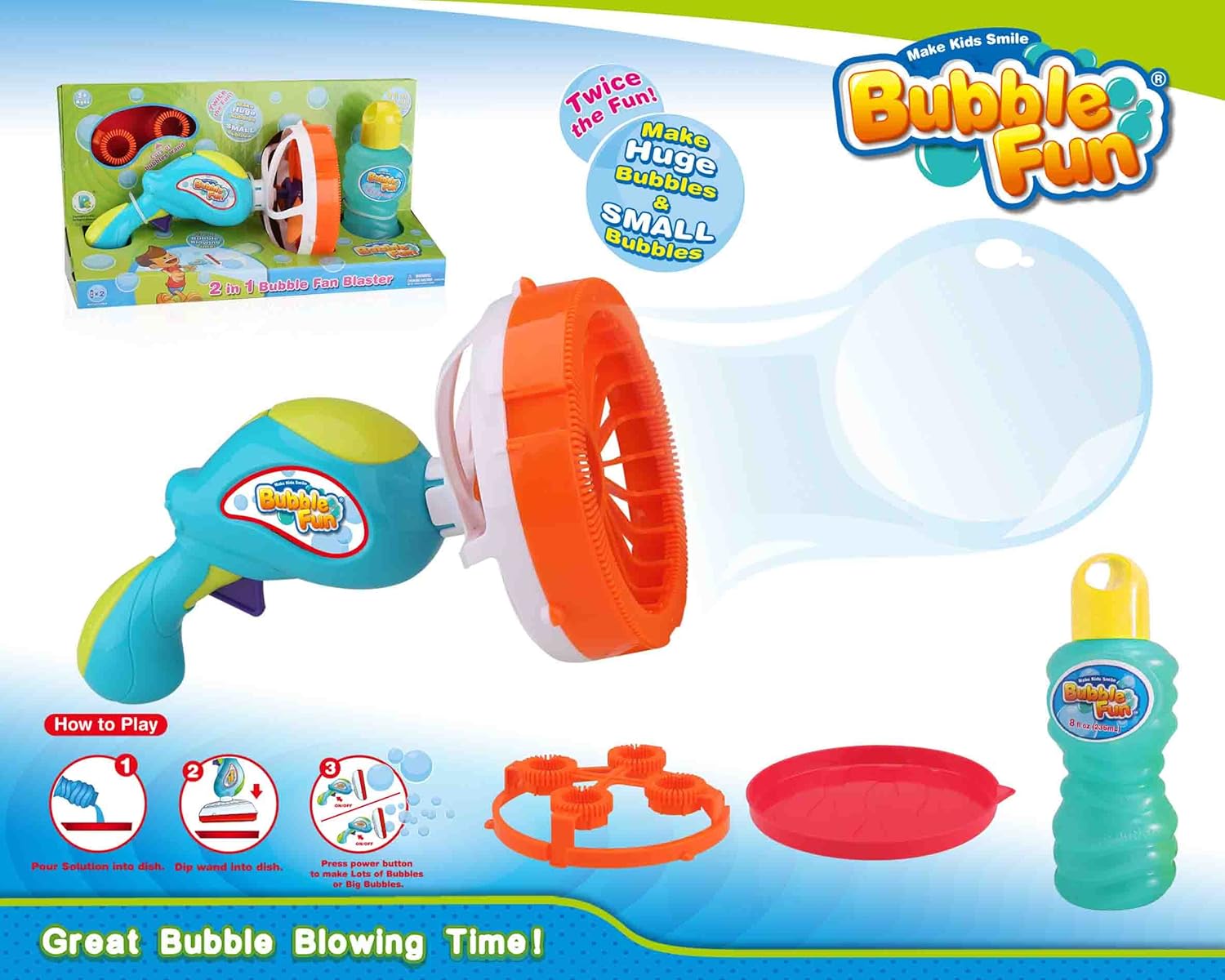 - Armed and ready for an alien adventure, this bubble fan blaster includes 8oz of super bubble solution, and a dipping tray for a virtually endless stream of bubbles.