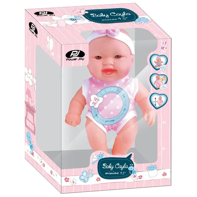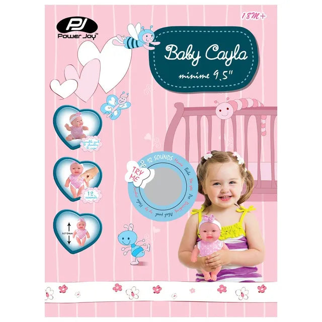Power Joy's Baby Cayla minime lifelike baby doll stands 9.5" tall. Press to enjoy 12 realistic sounds for endless playtime fun. Baby Cayla has turnable neck, shoulders and waist. It will be your kid's bestfriend as Baby Cayla has the best smile and eyes.