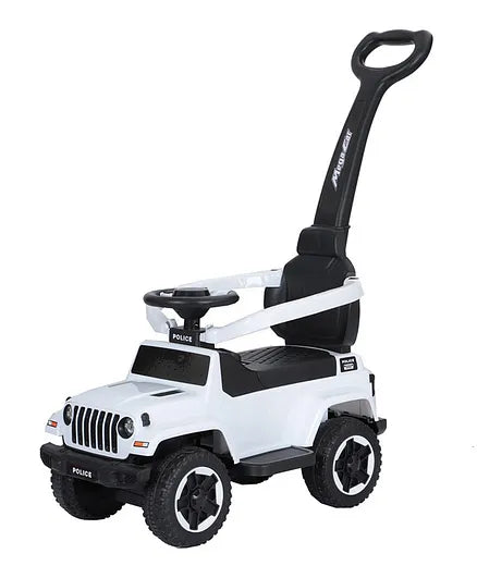 A battery ride-on for kids with pushbar. Offering light and music as well as side safety handles, this ride on car is a good choice for your kid. It also has a set backrest handle and a removable push one. Batteries are needed to play music and horn sounds.