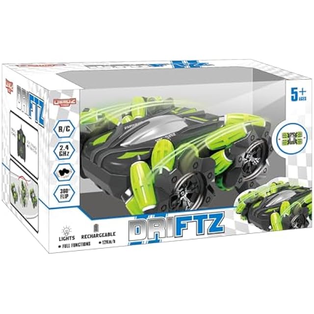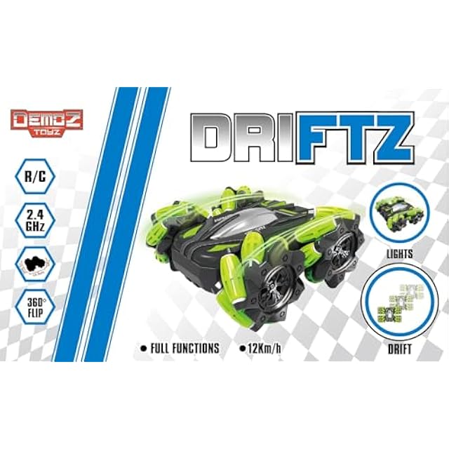 Demoz R/C Driftz 2.4GHz - full function remote controlled stunt car. 360 degree rotation drift stunt. Ready to run with maximum speed 12km/h, lithium rechargeable battery pack with USB charger. Made of certified strong ABS material, non-toxic, safe, durable, smooth surface without burrs. Enjoy endless indoor & outdoor stunt fun.
