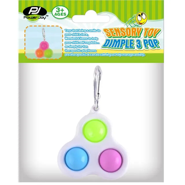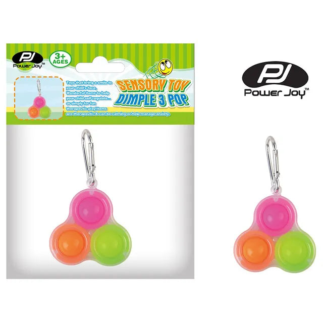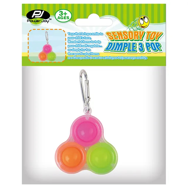 3 POP DIMPLES WITH KEYCHAIN. STRESS RELEASE SENSORY TOY. REDUCE STRESS, ANXIETY AND INCREASE FOCUS AND ATTENTION. CERTIFIED MATERIAL, SMOOTH WITHOUT BURRS FOR SAFE AND LONG POPING. SMALL SIZE WITH KEYCHAIN FOR ANYTIME ANYWHERE PRESSURE RELIEF