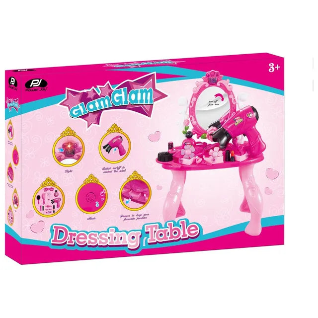 Fully certified battery operated dresser with light and sound. With battery operated hair dryer, comb, mirror, and beauty accessories to enjoy dress up fun. Drawer to keep your little one's favourite jewelries.