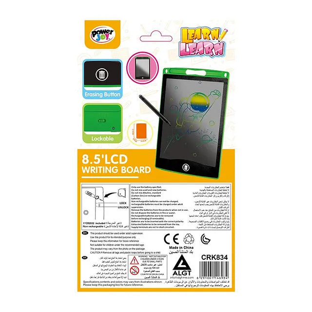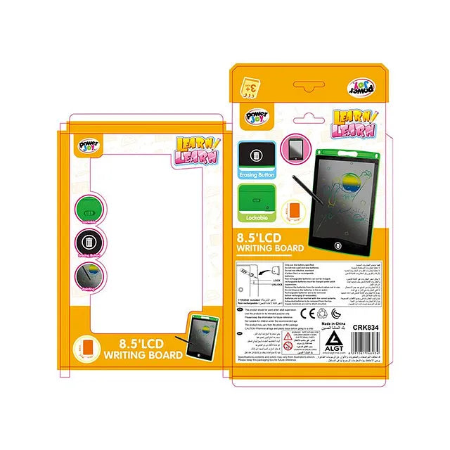 - Battery operated 8.5" LCD writing board with erase key and screen lock function.