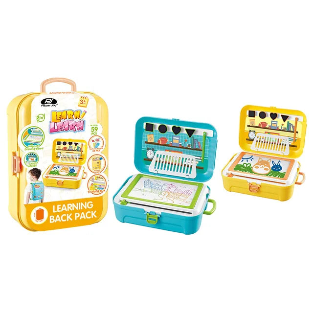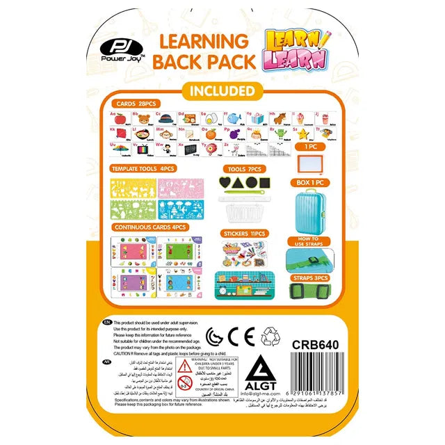 - 59 pieces learning backpack with templetes, cards,magnetic drawing board, stickers and card holder.
