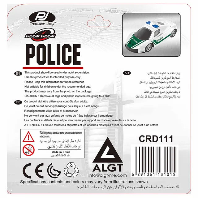 1/43 die-cast police car. Pull back to run the car up to 6 meters. Made with certified quality plastic and alloy,non-toxic, and safe for play.best gift for your little loved one to play with & collect.