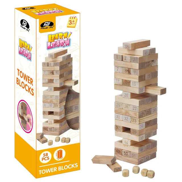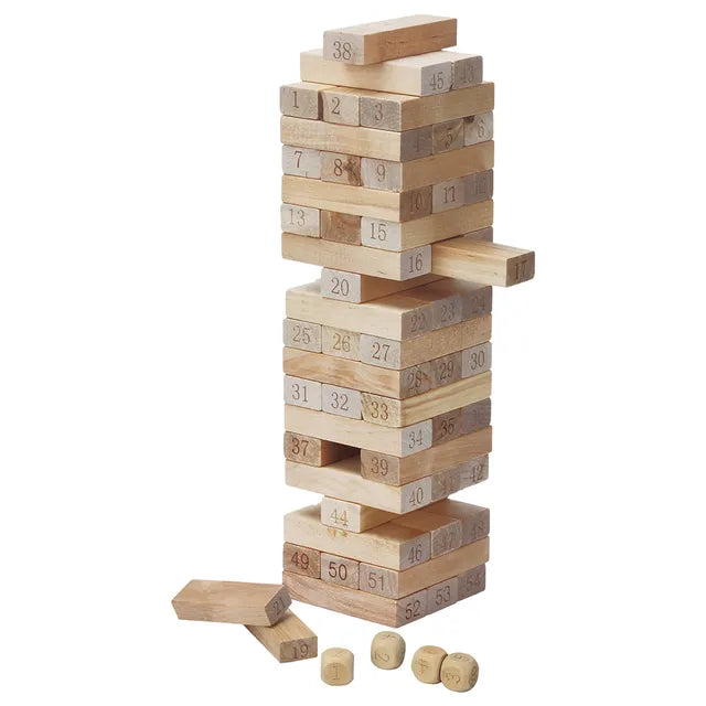 54 pieces of high-quality handcrafted hardwood blocks and 4 dices. High-quality, chemical-free,the edges of the blocks are meticulously rounded and extra smooth, which is safer and harmless for children. Great gift for kidz to play anywhere and anytime.