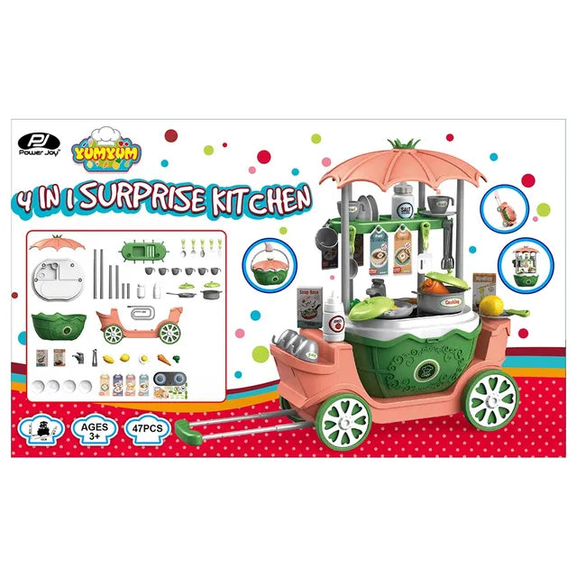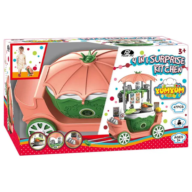 Pretend Play 4-in-1 Surprise Kitchen Toys playset for kids. 47 pieces of 4in1 surprise kitchen with a removable basket and a trolley carrying case for portabla and convenient storage. Made of harmless ABS material, non-toxic, safe, durable, smooth surface without burrs to ensure that children's fingers are not scratched. Big size of L 48CM X W 18.5CM X H 39.5CM and smooth rolling wheel, easy to assemble & drag. Permit your little kids to have endless hours of fun through our unique surprise kitchen which can transform into 4 forms.
