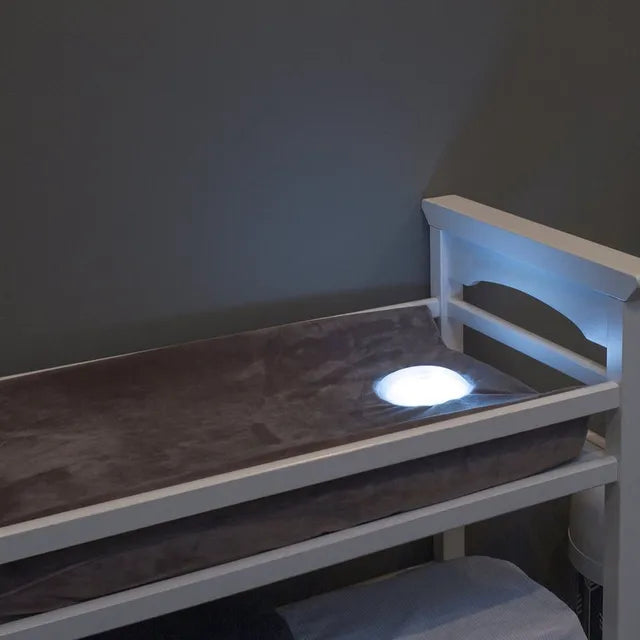 Kit includes: Custom changing pad cover with integrated silicone light shield, magnetic LED light with a 1,2,5 minute and always ON timer with auto-shutoff feature, magnetic locator that positions the light on the mat to correspond with the transparent silicone shield integrated into the cover.