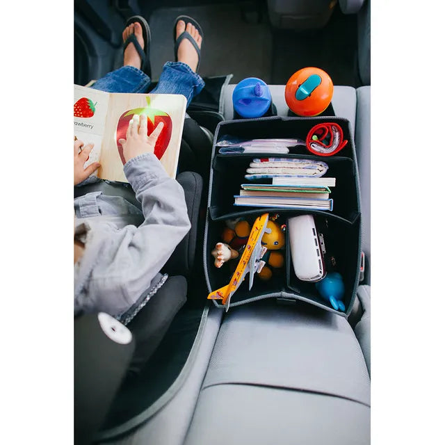We've found that our kids actually enjoy putting things in their place, so we made them a place. Consider it the cubby of our car, something our kids can relate to and that keeps our car cleaner and our sanity intact.
