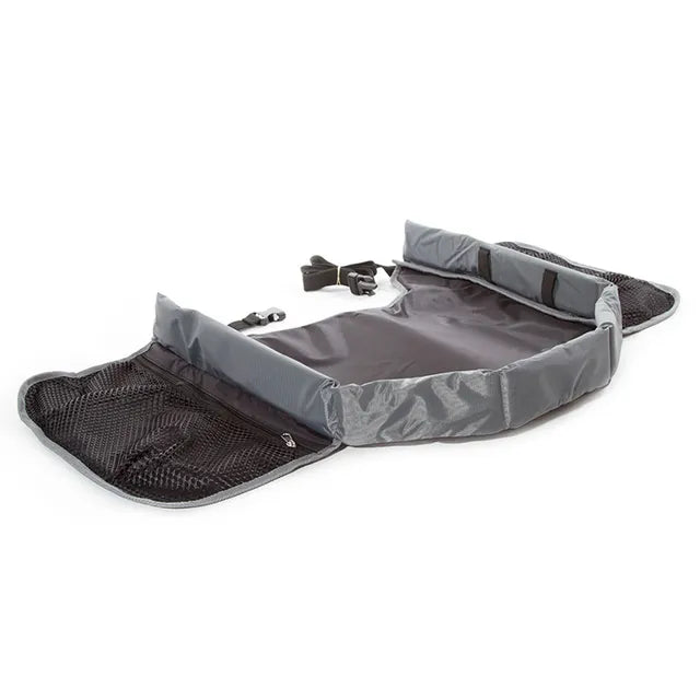 Snack & Play on the go. Perfect for playing or eating safely in the car, plane, train or stroller. Mesh pockets keeps item like toys, books or snack in reach. Straps securely around child and unbuckles easily for quick removal Prince Lionheart Travel Tray.