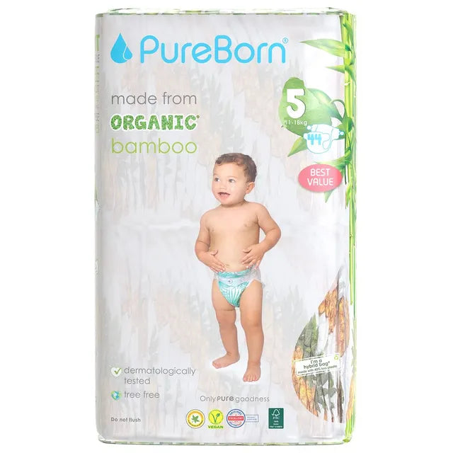 Our nappies are eco-friendly, made with organic bamboo pulp. They are free from harmful chemicals and intended for use by babies and toddlers up to 2 & 1/2 years of age. PureBorn Eco Organic Bamboo Baby Nappies are ultra-soft, with a cloth-like feel to provide maximum comfort for the babies. They are made with unbleached bamboo fibres in the core layer and soft non-woven fabric on both top and bottom layers to provide the best comfort and protection on the most sensitive skin.
