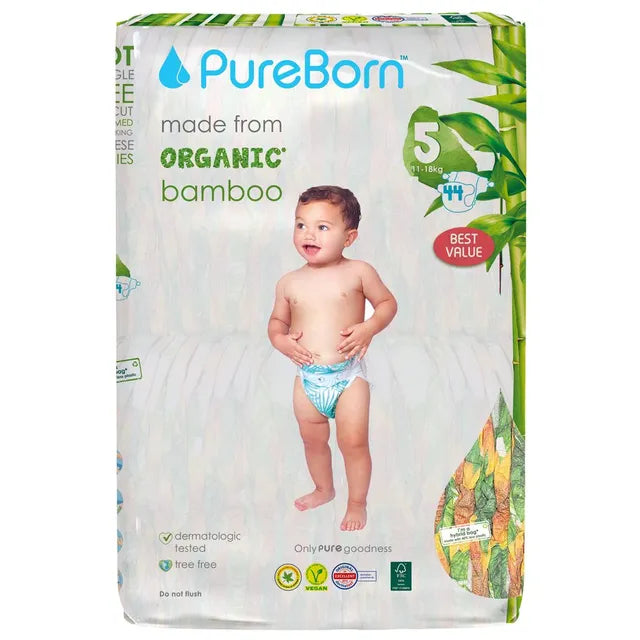Our nappies are eco-friendly, made with organic bamboo pulp. They are free from harmful chemicals and intended for use by babies and toddlers up to 2 & 1/2 years of age. PureBorn Eco Organic Bamboo Baby Nappies are ultra-soft, with a cloth-like feel to provide maximum comfort for the babies. They are made with unbleached bamboo fibres in the core layer and soft non-woven fabric on both top and bottom layers to provide the best comfort and protection on the most sensitive skin.