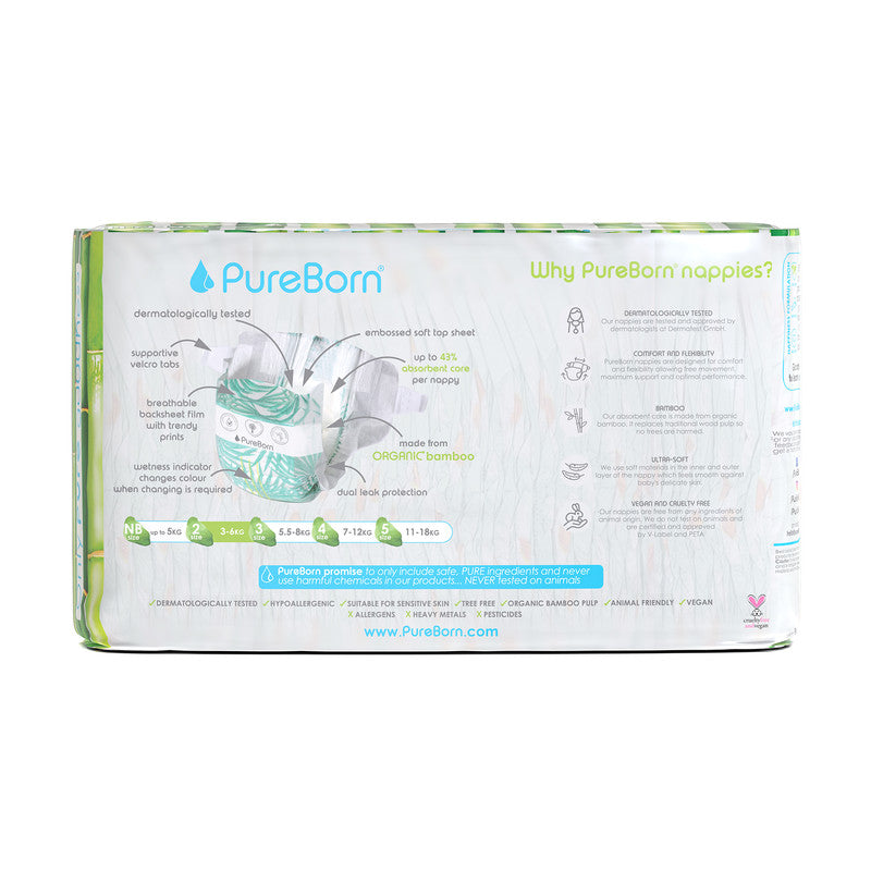 Our nappies are eco-friendly, made with organic bamboo pulp. They are free from harmful chemicals and intended for use by babies and toddlers up to 2 & 1/2 years of age. PureBorn Eco Organic Bamboo Baby Nappies are ultra-soft, with a cloth-like feel to provide maximum comfort for the babies. They are made with unbleached bamboo fibres in the core layer and soft non-woven fabric on both top and bottom layers to provide the best comfort and protection on the most sensitive skin.