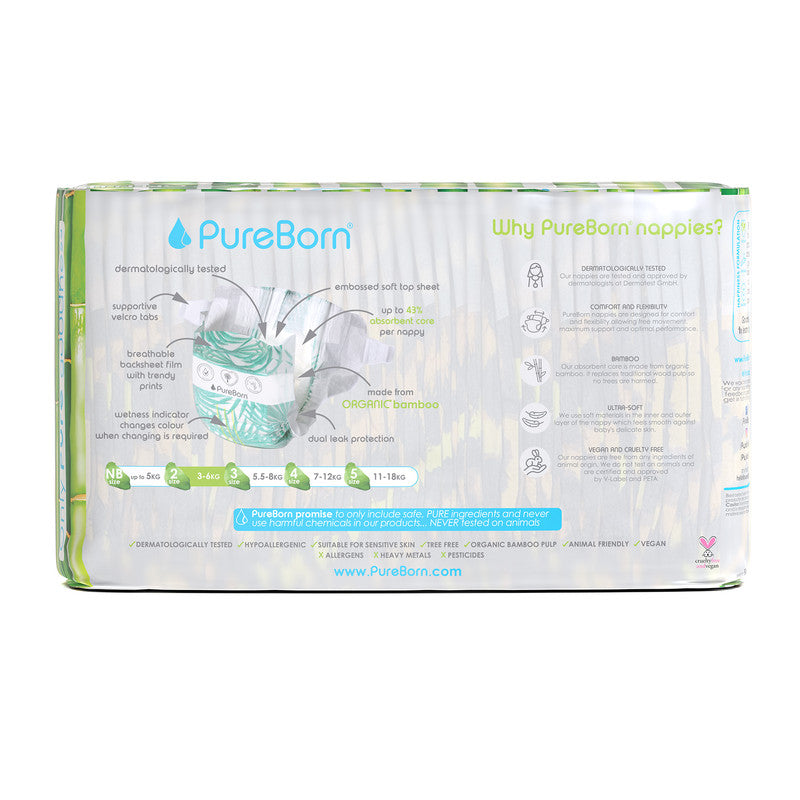 Our nappies are eco-friendly, made with organic bamboo pulp. They are free from harmful chemicals and intended for use by babies and toddlers up to 2 & 1/2 years of age. PureBorn Eco Organic Bamboo Baby Nappies are ultra-soft, with a cloth-like feel to provide maximum comfort for the babies. They are made with unbleached bamboo fibres in the core layer and soft non-woven fabric on both top and bottom layers to provide the best comfort and protection on the most sensitive skin.